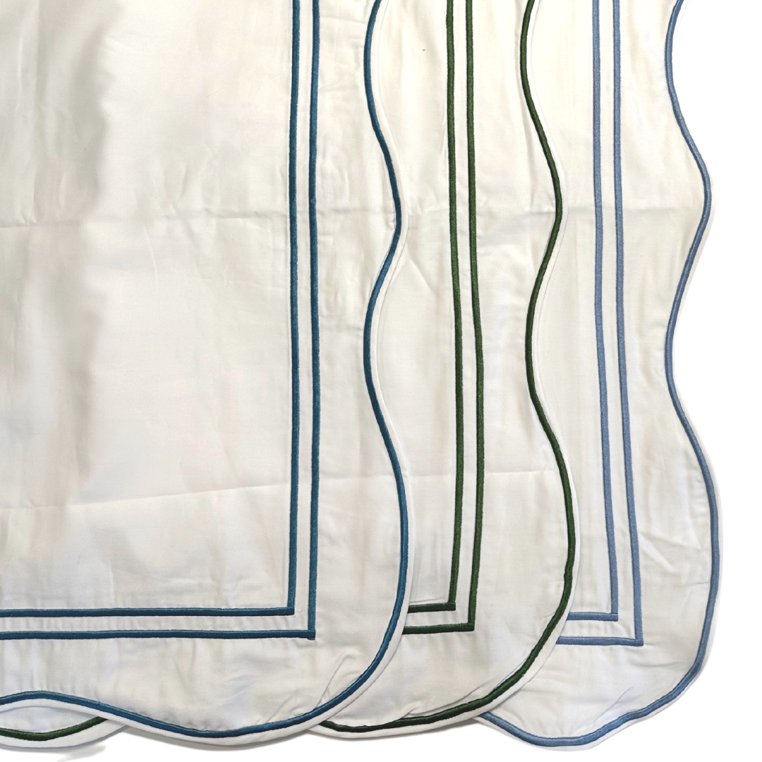 Our 400TC cotton updated scallop edged embroidered sheet set comes with a fitted and flat sheet and a pair of pillowcases. We can custom color the thread to match the other fabrics and colors within your room. We offer this service free of charge.