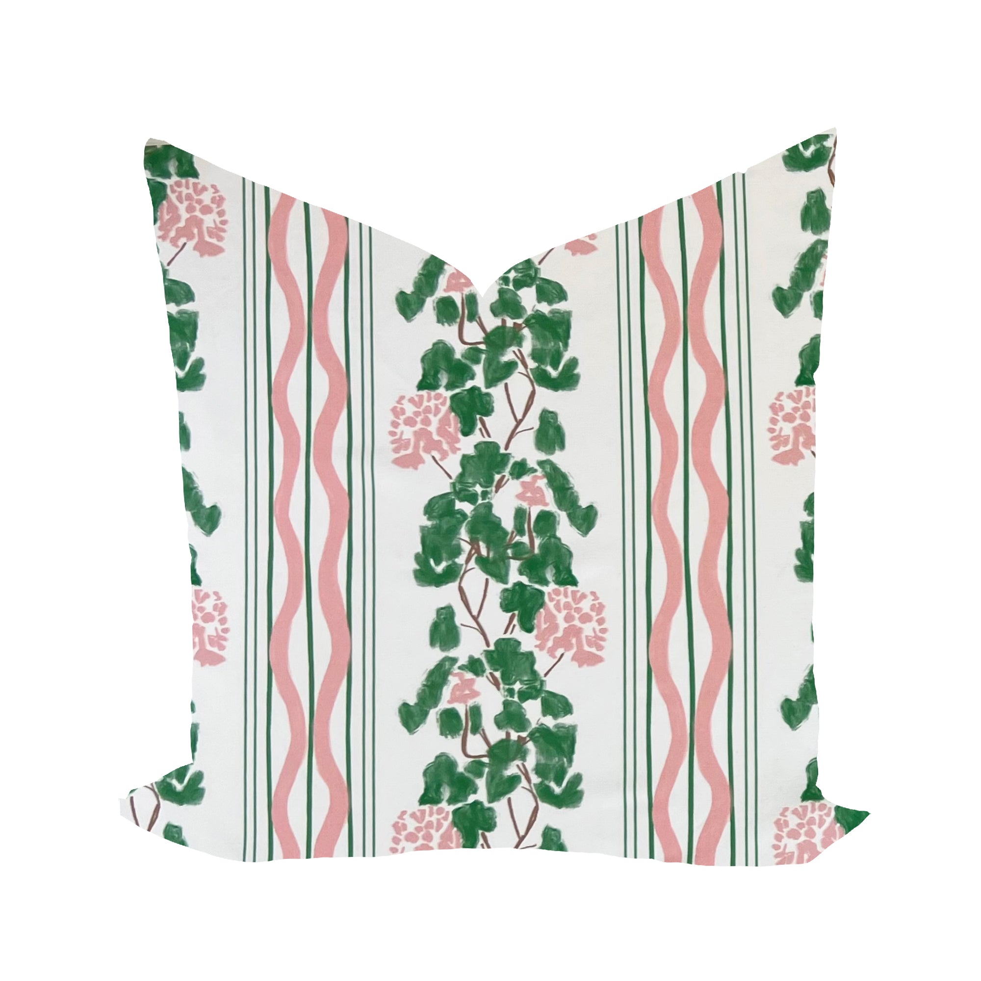 One decorative pillow cover featuring a floral/botanical design on home decor weight fabric by artist Lulie Wallace.