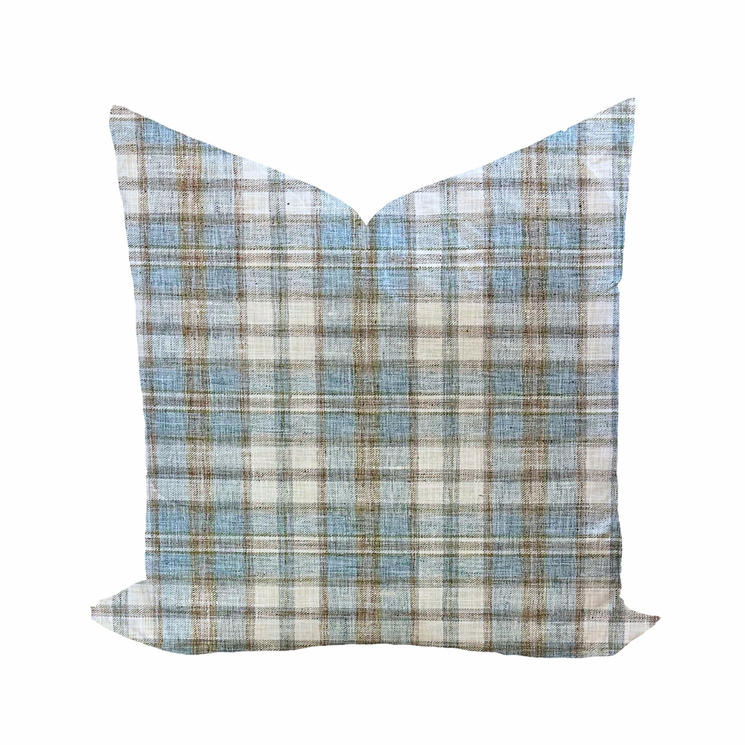 One decorative pillow cover featuring a suiting plaid design in navy & rust.