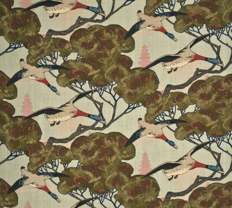 One decorative pillow cover featuring a flying duck print design on decor weight fabric.