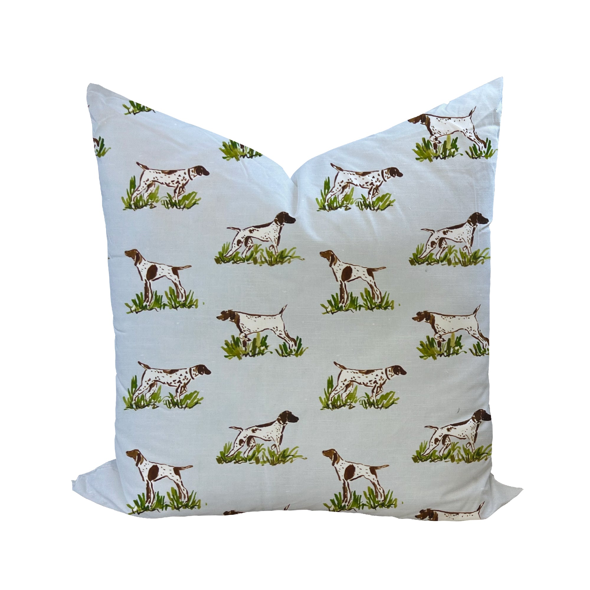 One decorative pillow cover featuring a spaniel dog design on home decor weight fabric by artist Camilla Moss.