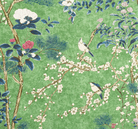 Airy and artistic, Katsura showcases gracious linework with fine vertical branches, blossoms, and birds.