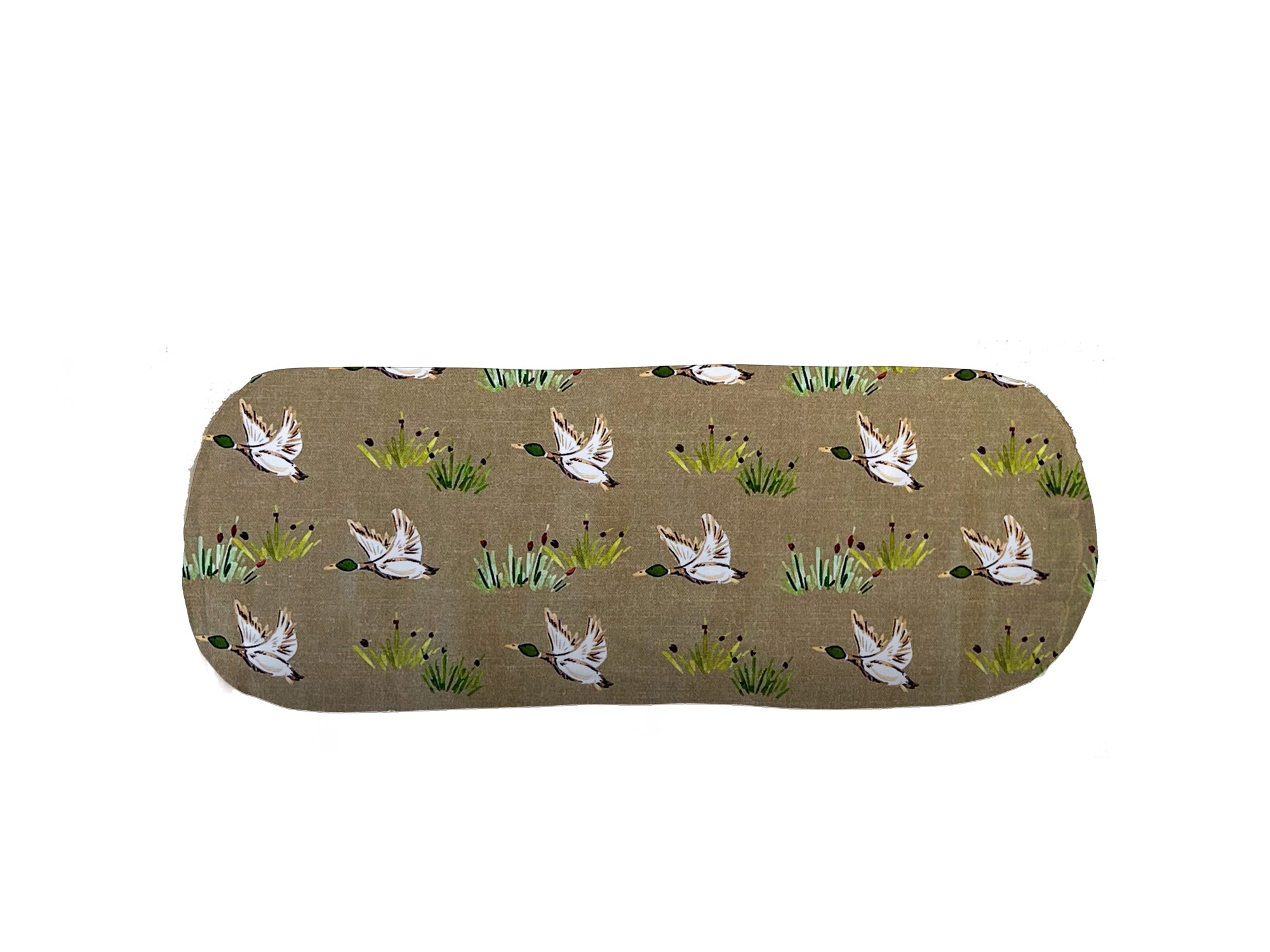 One decorative pillow cover featuring a flying ducks scene on home decor weight fabric by artist Camilla Moss. This design is an exclusive to Wheaton Whaley Home!