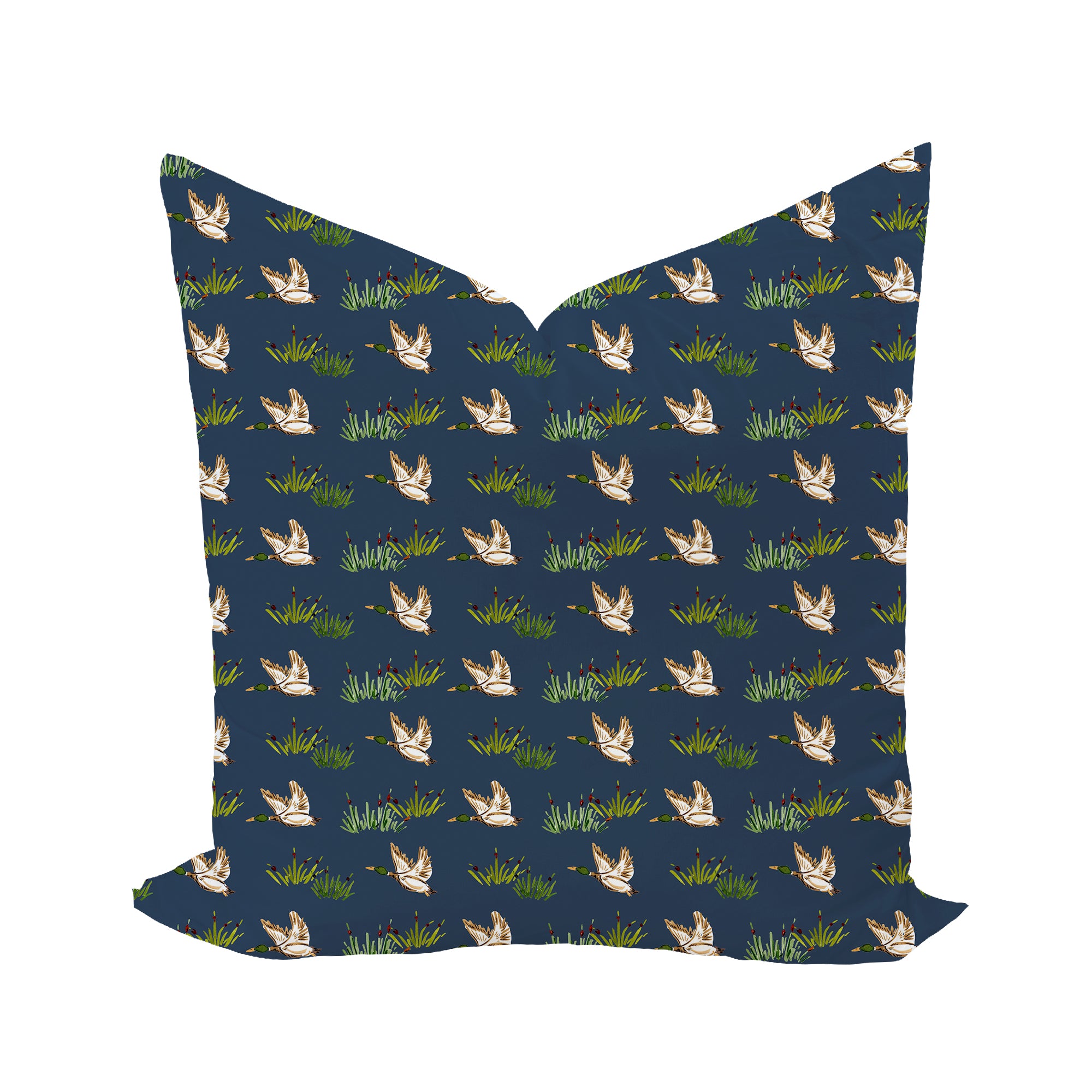 One decorative pillow cover featuring a flying duck design on home decor weight fabric by artist Camilla Moss.