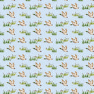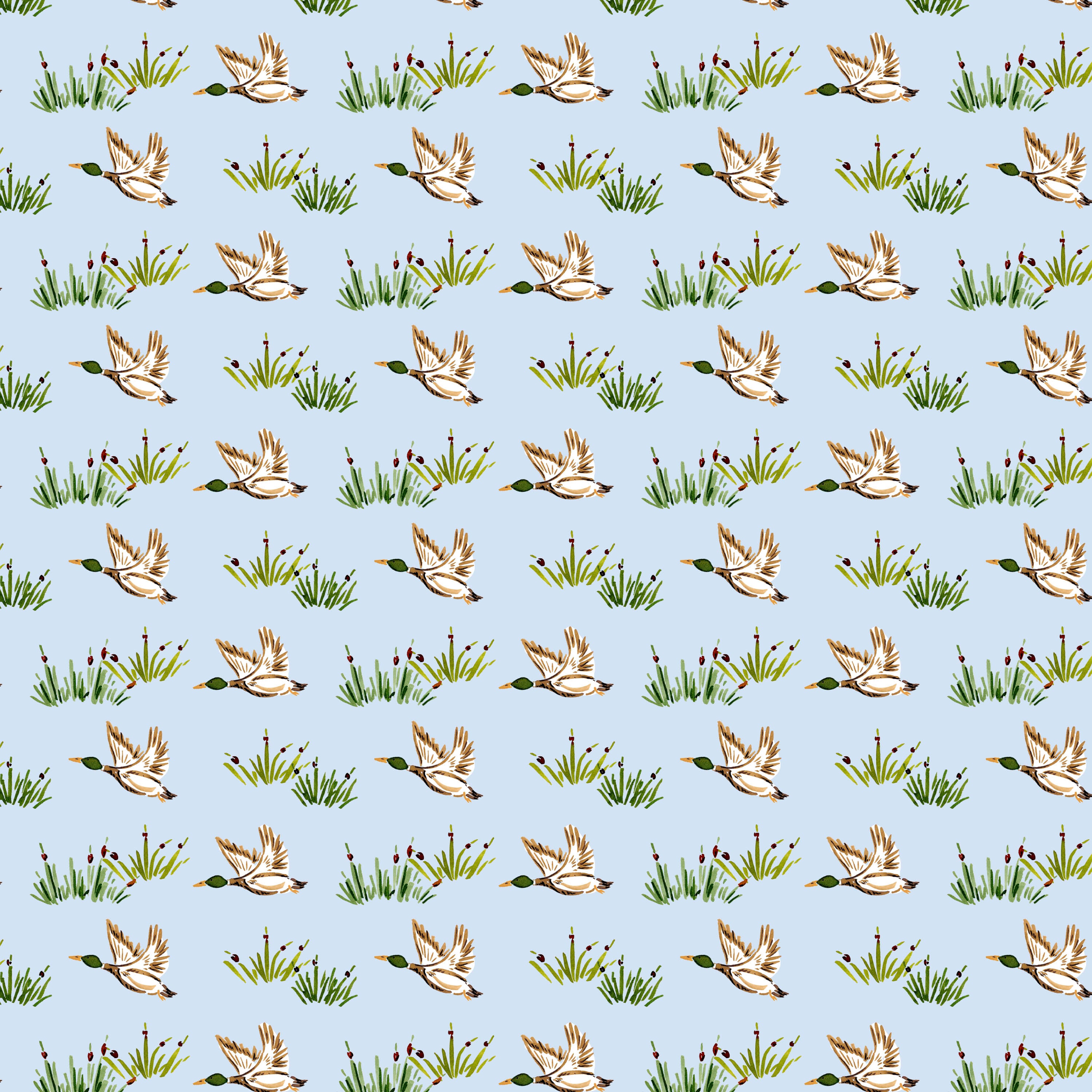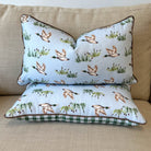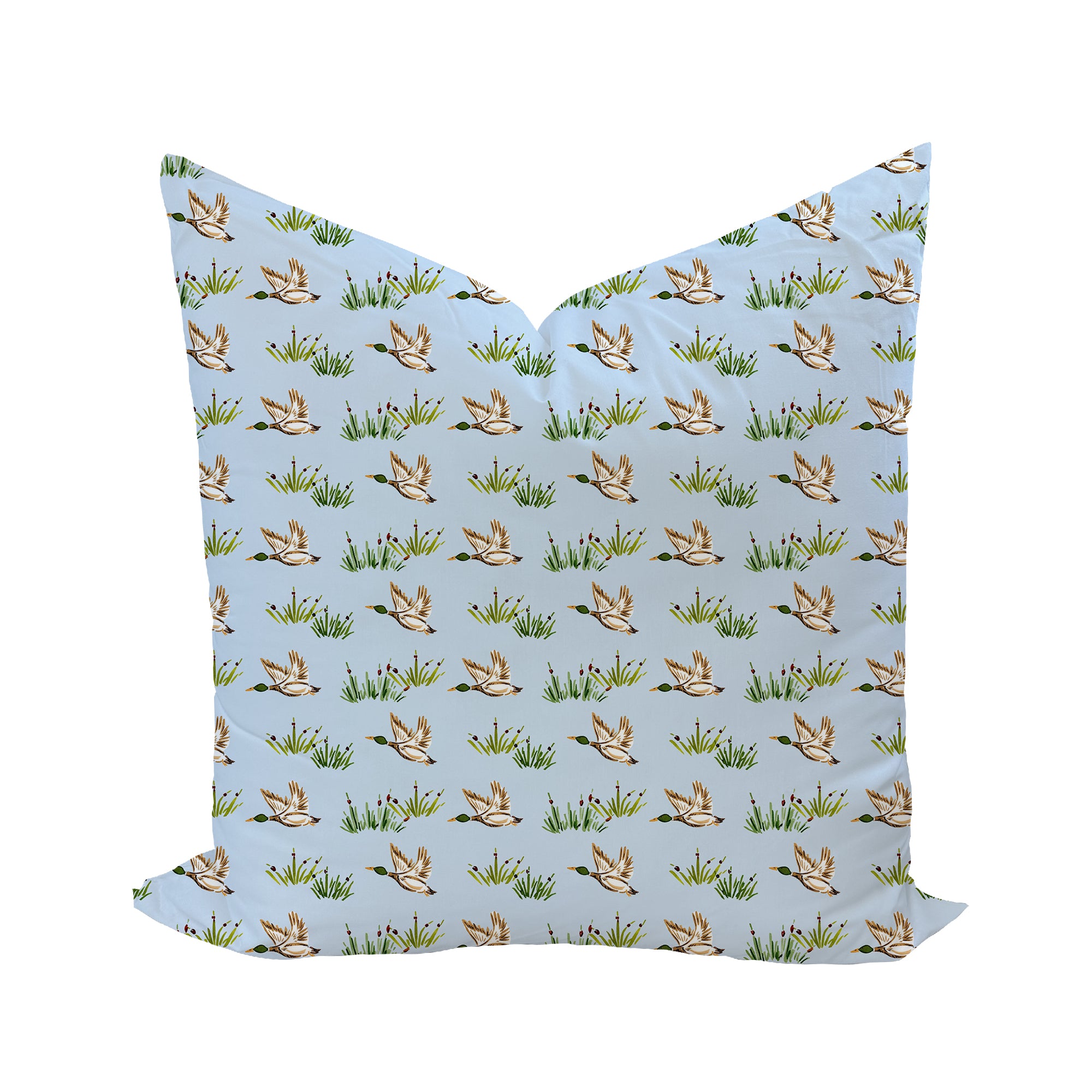 One decorative pillow cover featuring a flying duck design on home decor weight fabric by artist Camilla Moss.