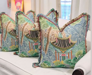 One decorative pillow cover featuring a chinoiserie/pagoda design on home decor weight fabric by Clarence House.