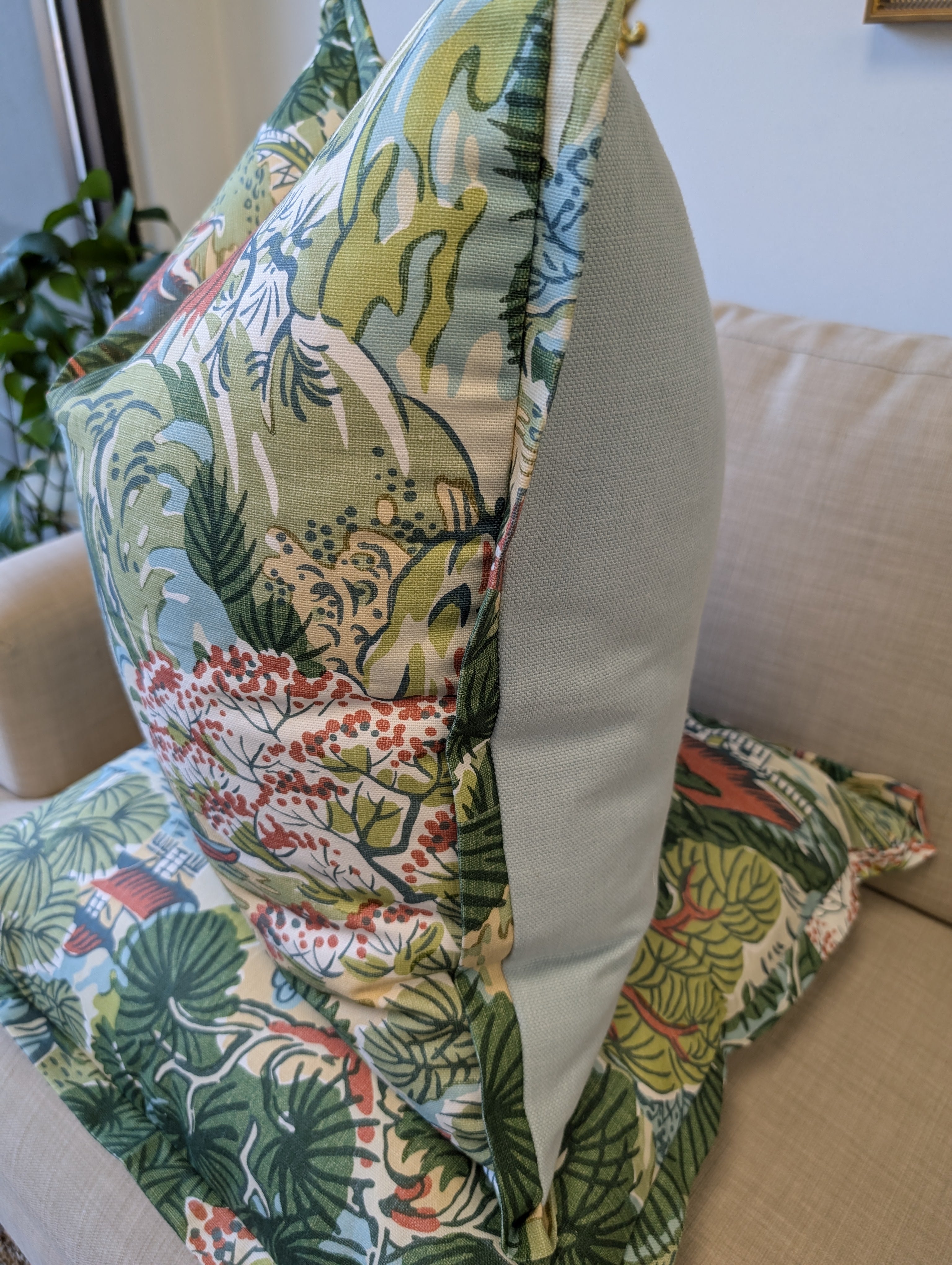 For a custom made look, covers feature a solid back. Placement of the pattern may vary from front to back & from pillow to pillow. We do not guarantee a matching set as our default, but are happy to set up a custom order for matching covers.