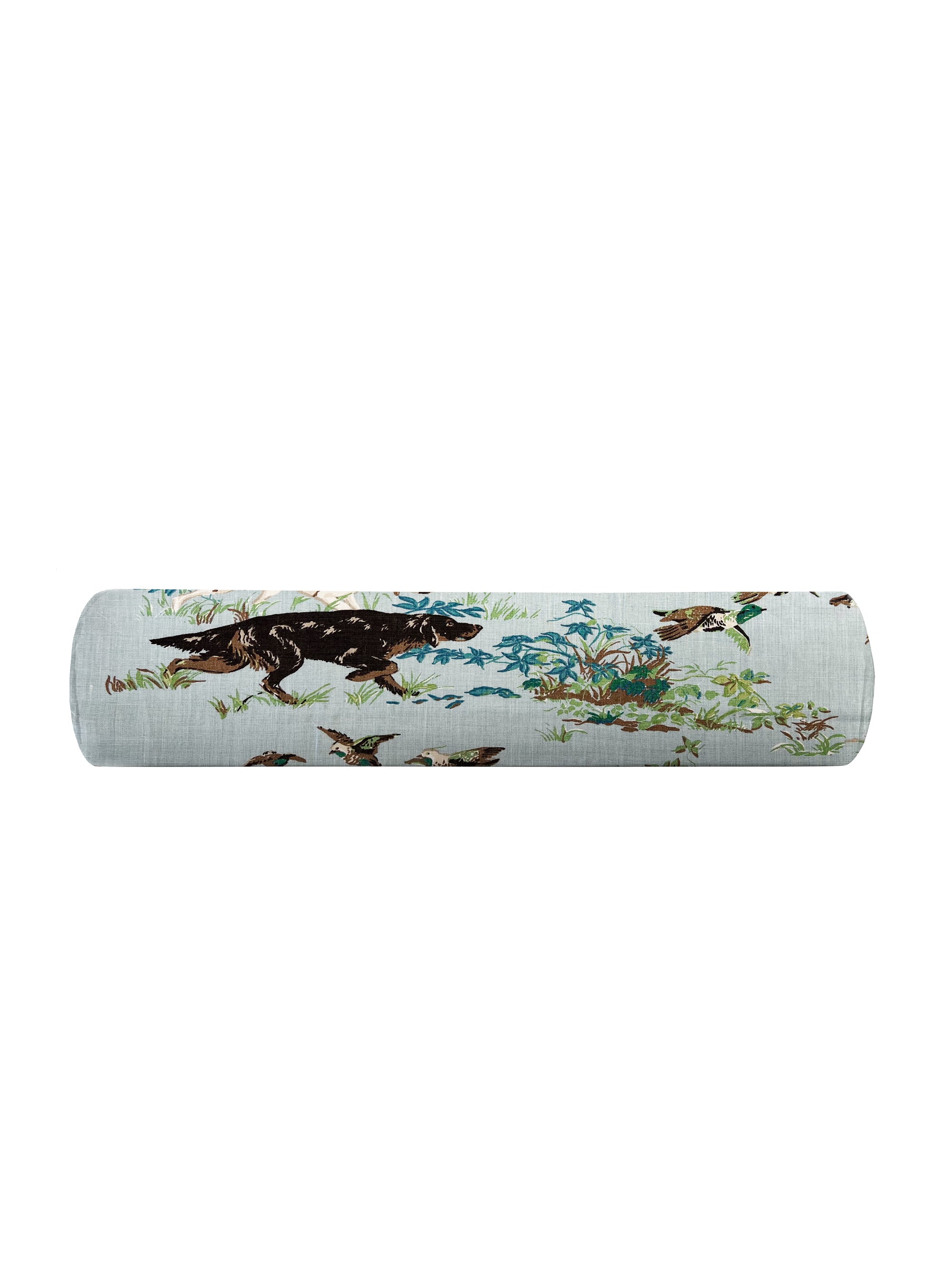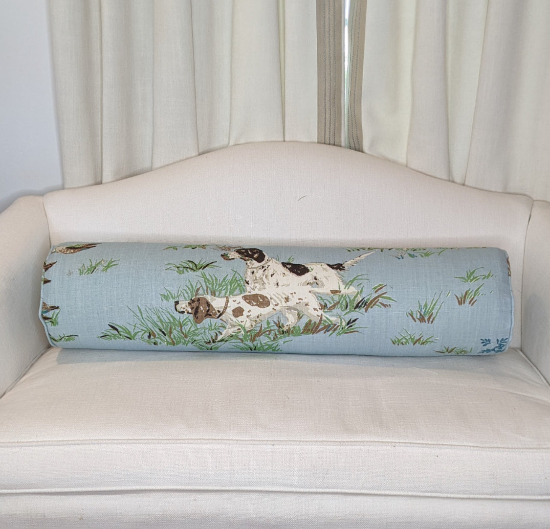 One decorative pillow cover featuring a hunting dog scene on home decor weight fabric by Schumacher.
