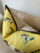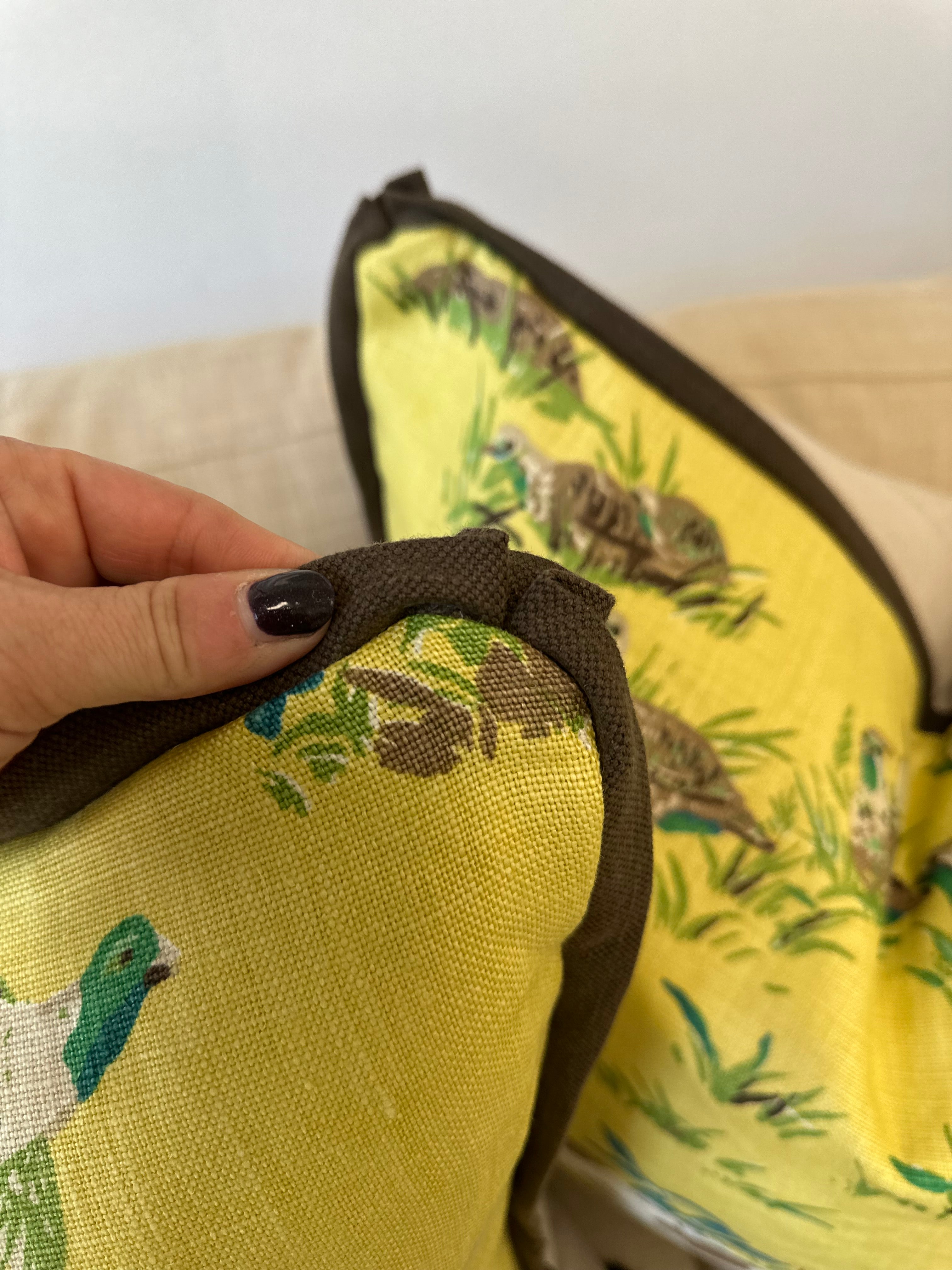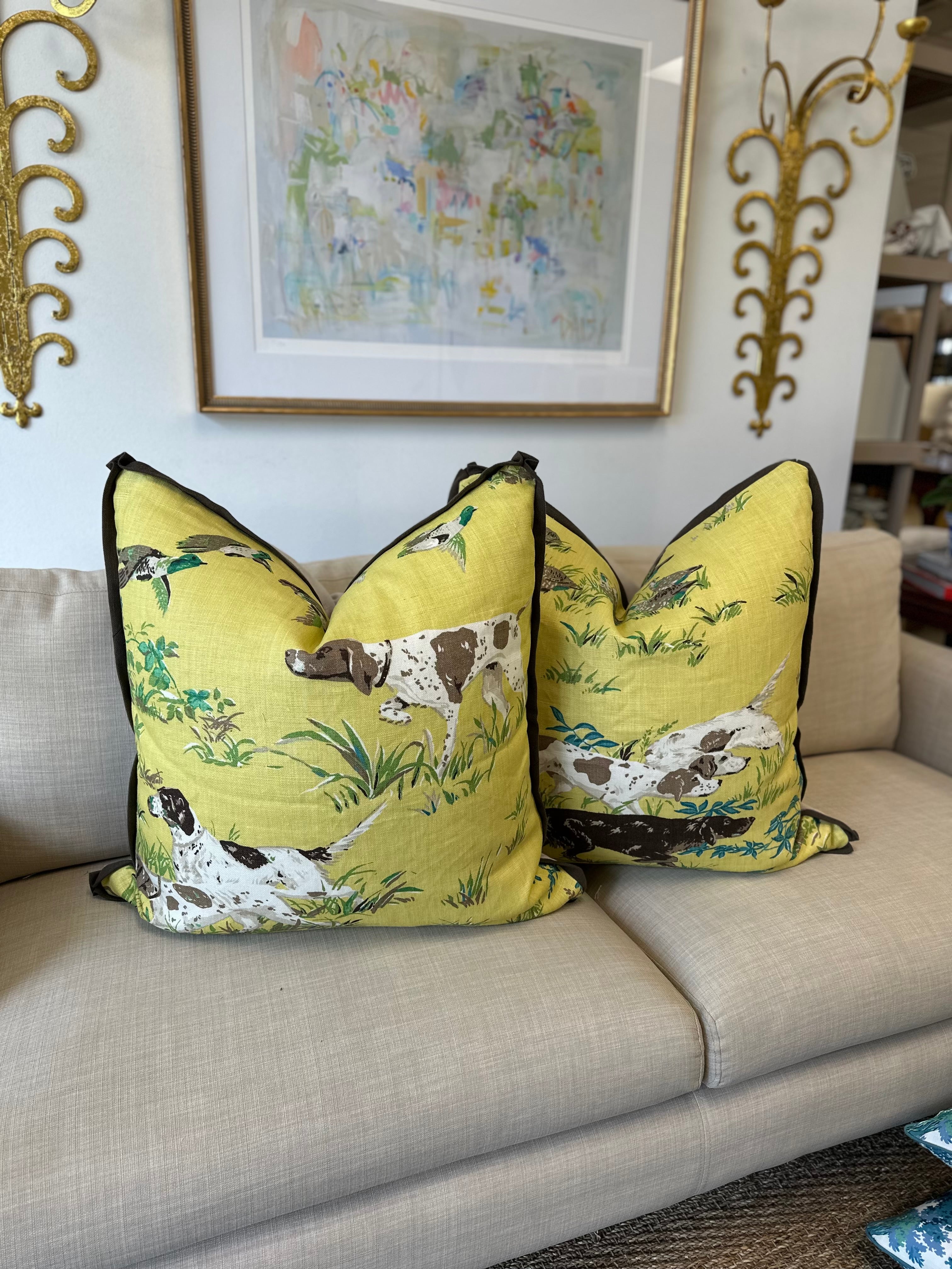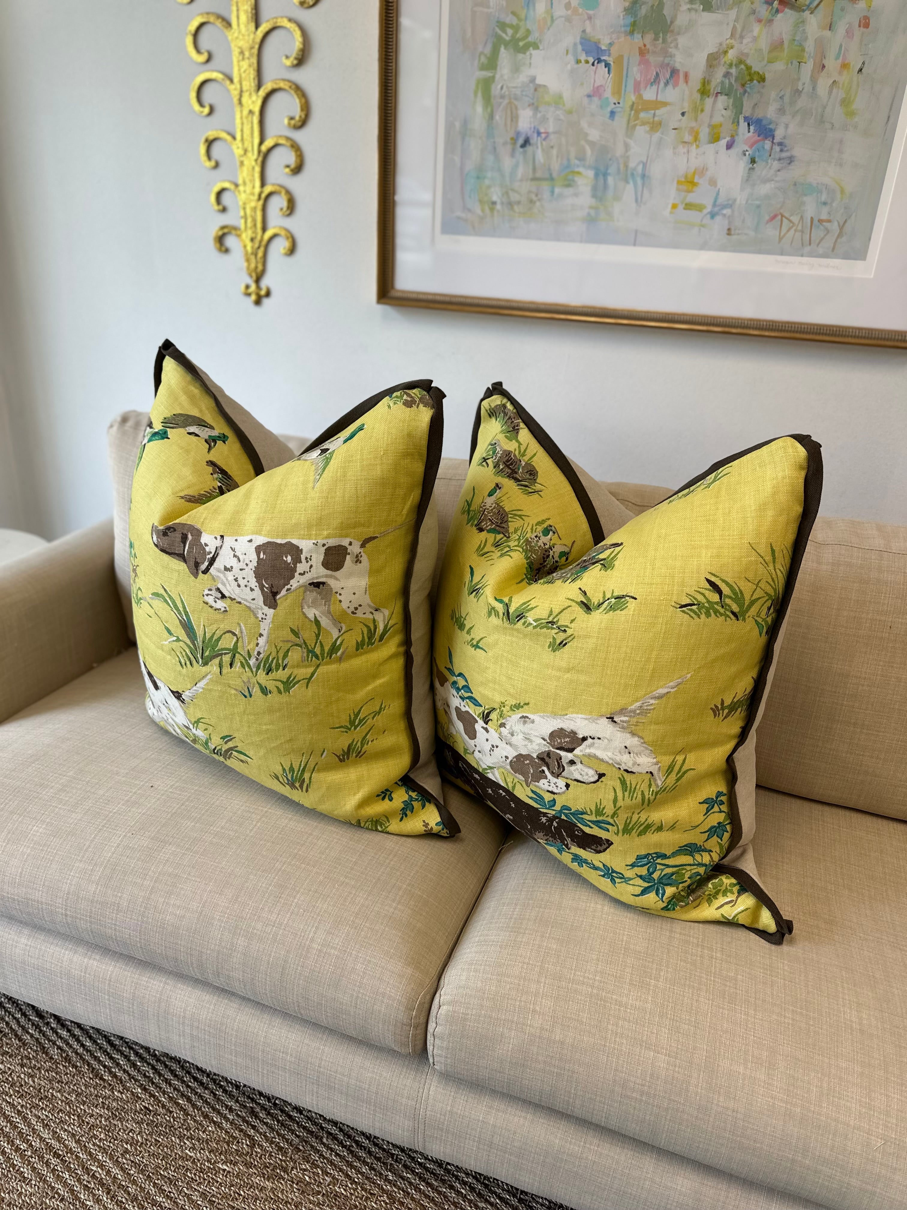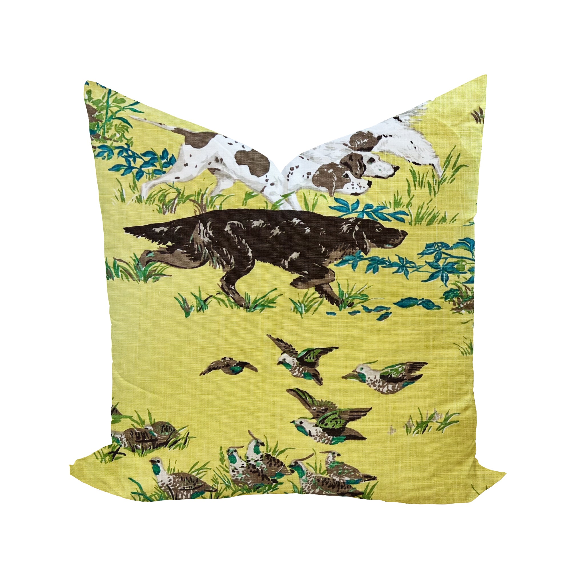 One decorative pillow cover featuring a hunting dog scene on home decor weight fabric by Schumacher.