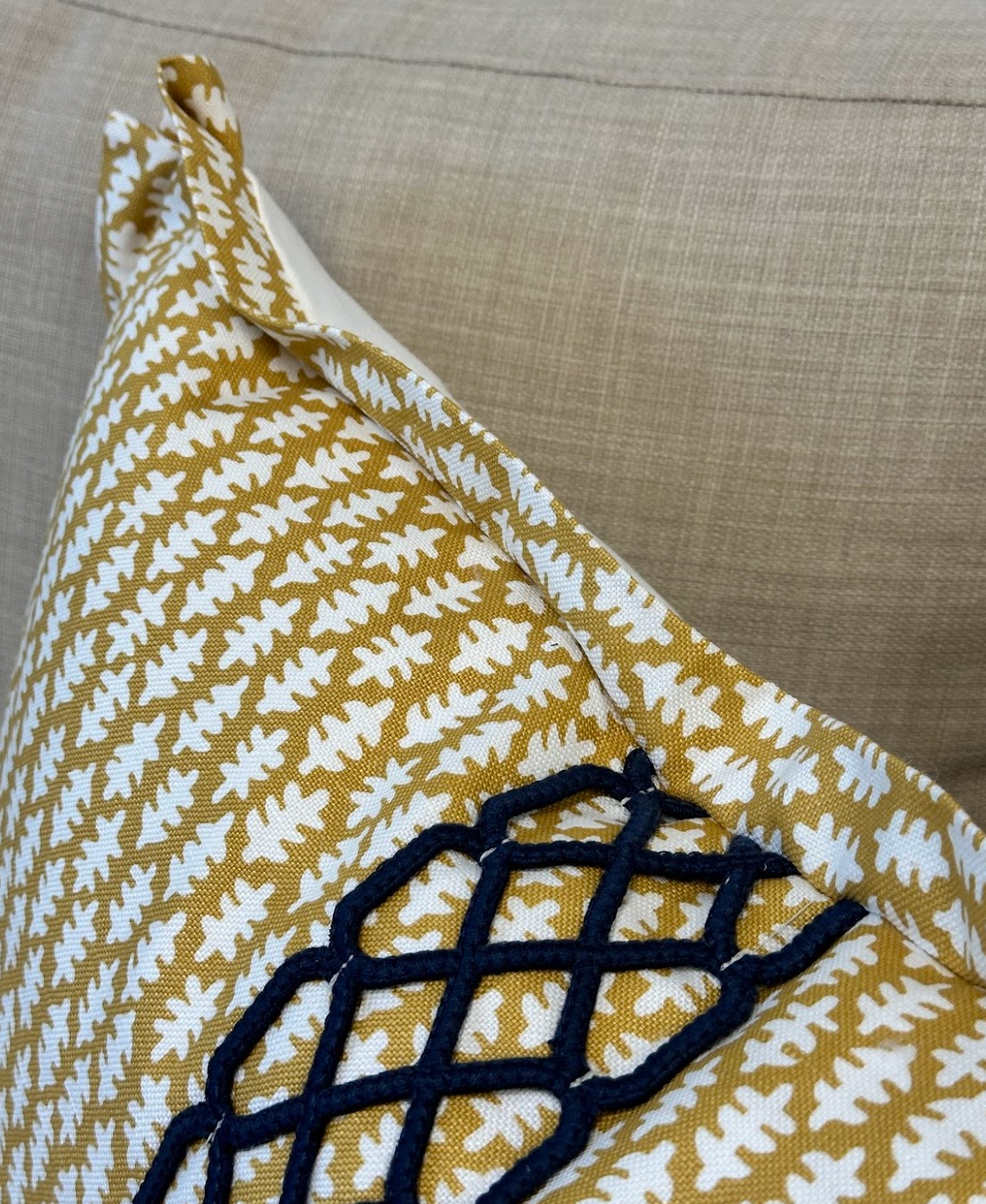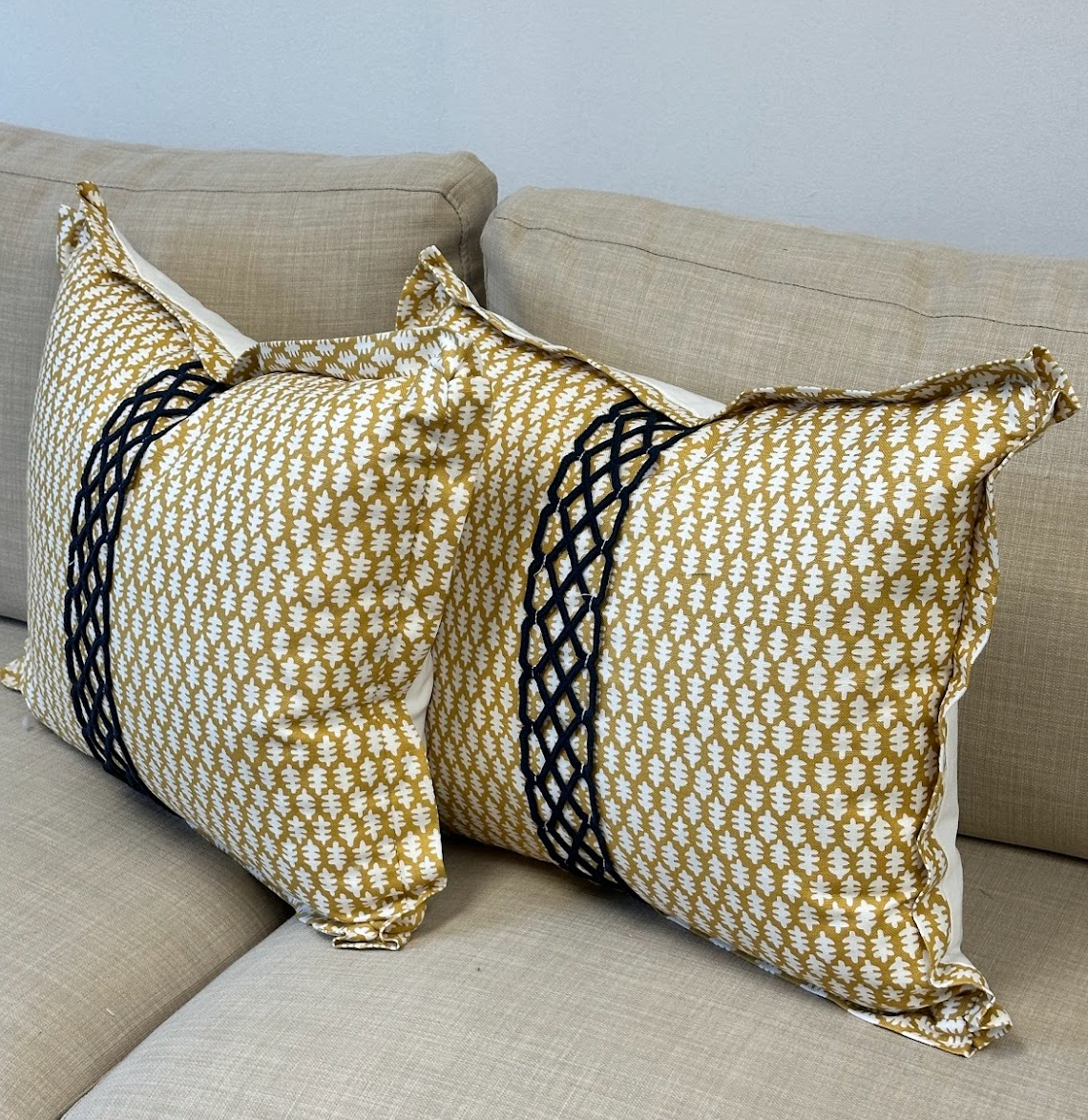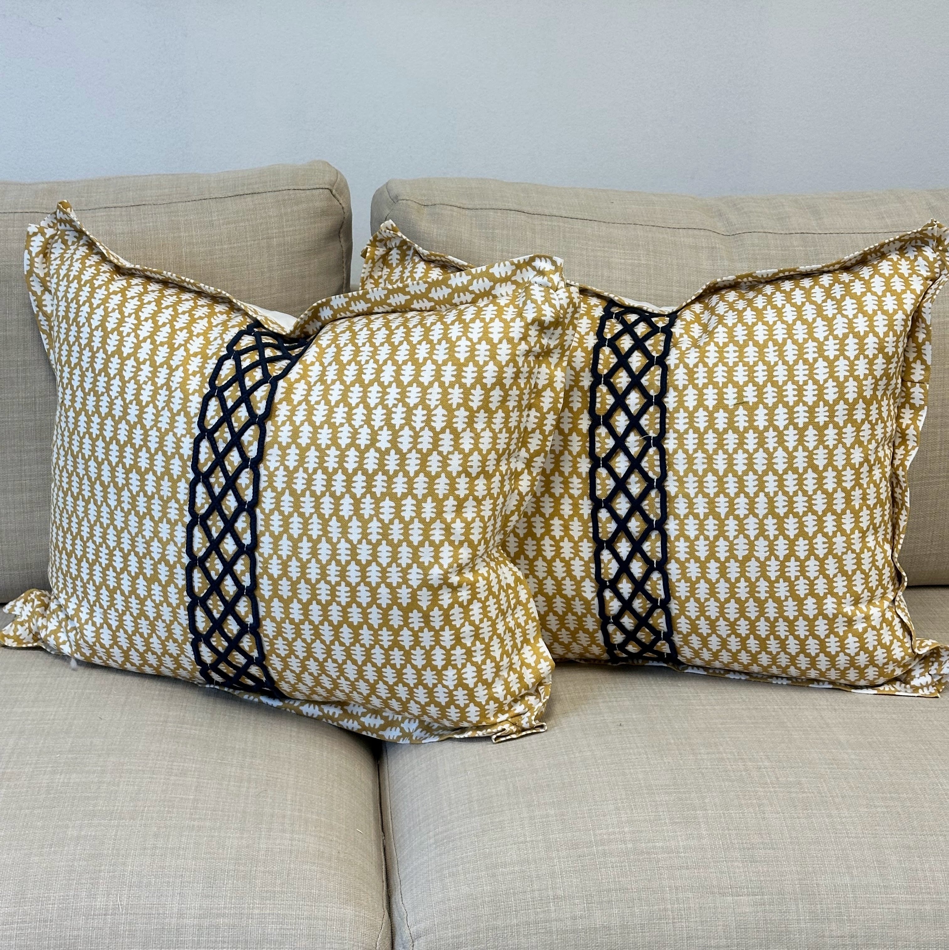 Ready to Ship :: Vivienne in Mustard with Navy Trellis Trim Pillow Covers (PAIR) for 18x22" inserts