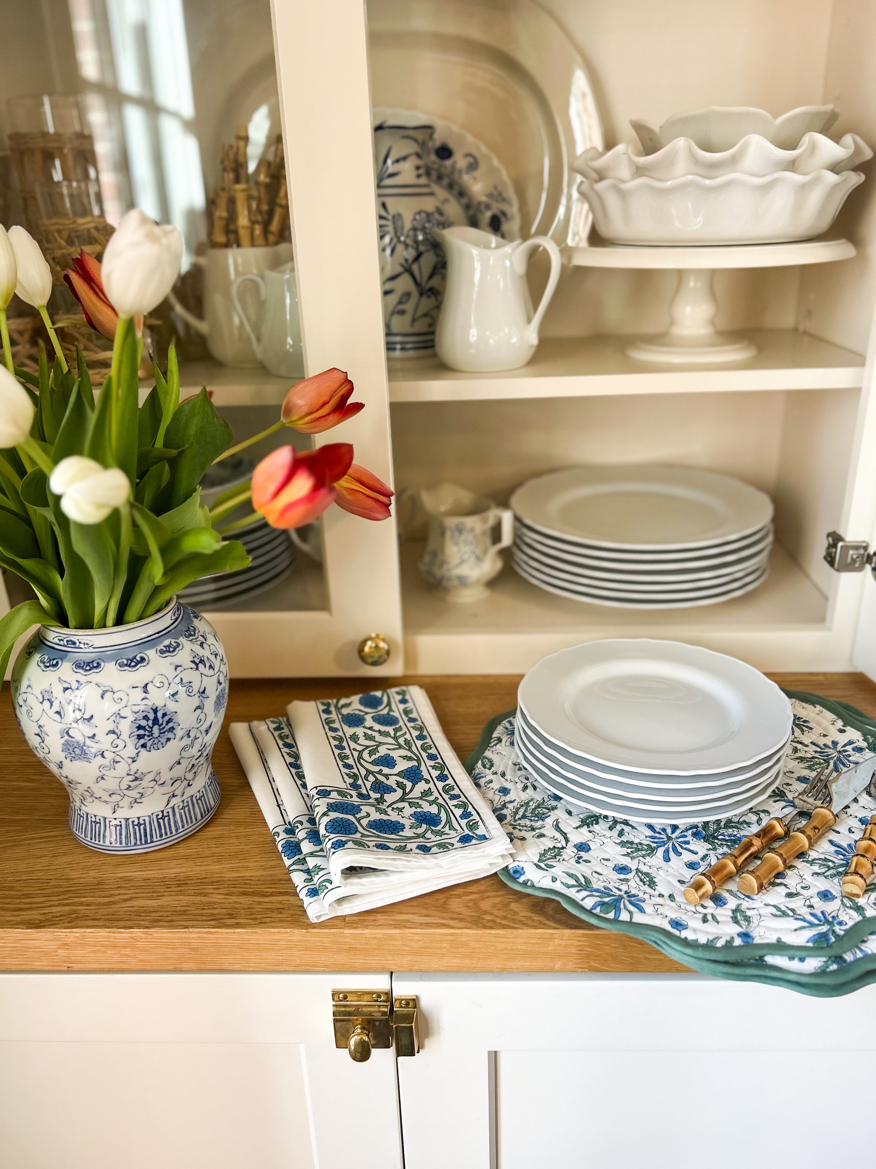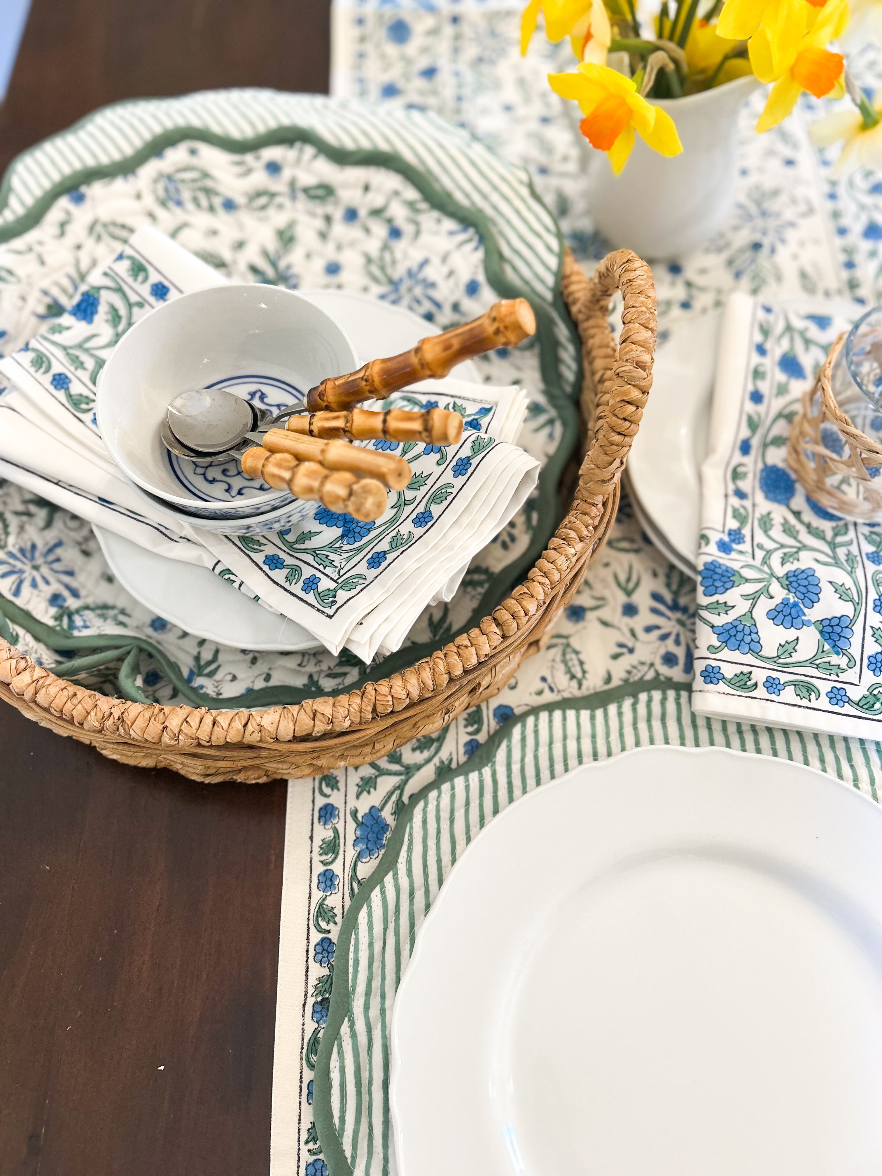 PRODUCT DESCRIPTION: Set of 4 quilted placemats features a delicate scalloped edge and a reversible pattern. Each round placemat measures 14” in diameter.