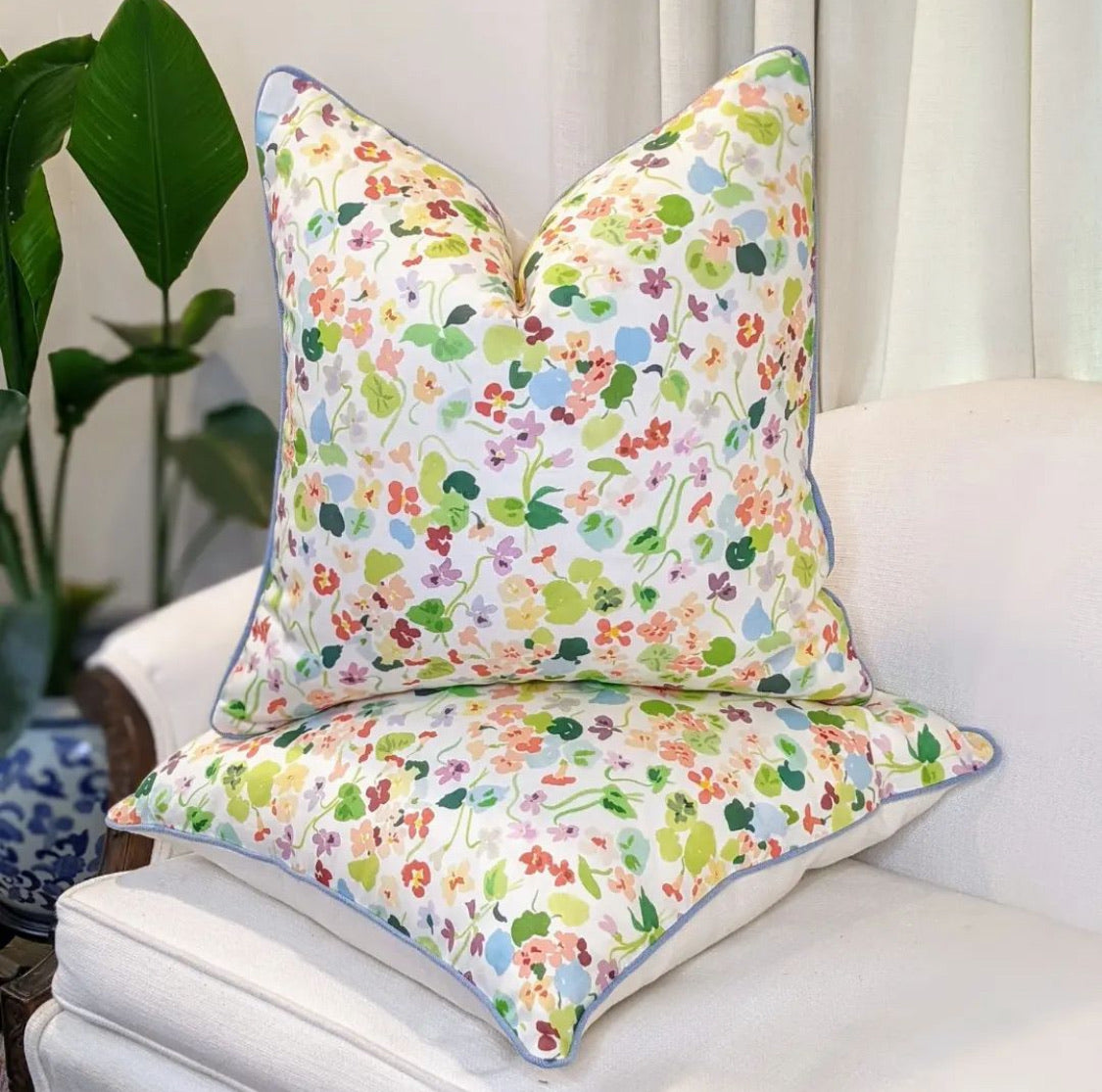 These combinations are ones that we have tested and are approved by us (and by you all as well, as these are typically our best sellers). Featured is Petals by Caitlin McGauley with a neutral back and periwinkle blue piping.