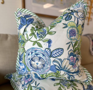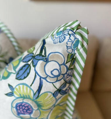 This combo is Peony Garden in Blue & Green with Carlisle Stripe as Flange and a solid back.