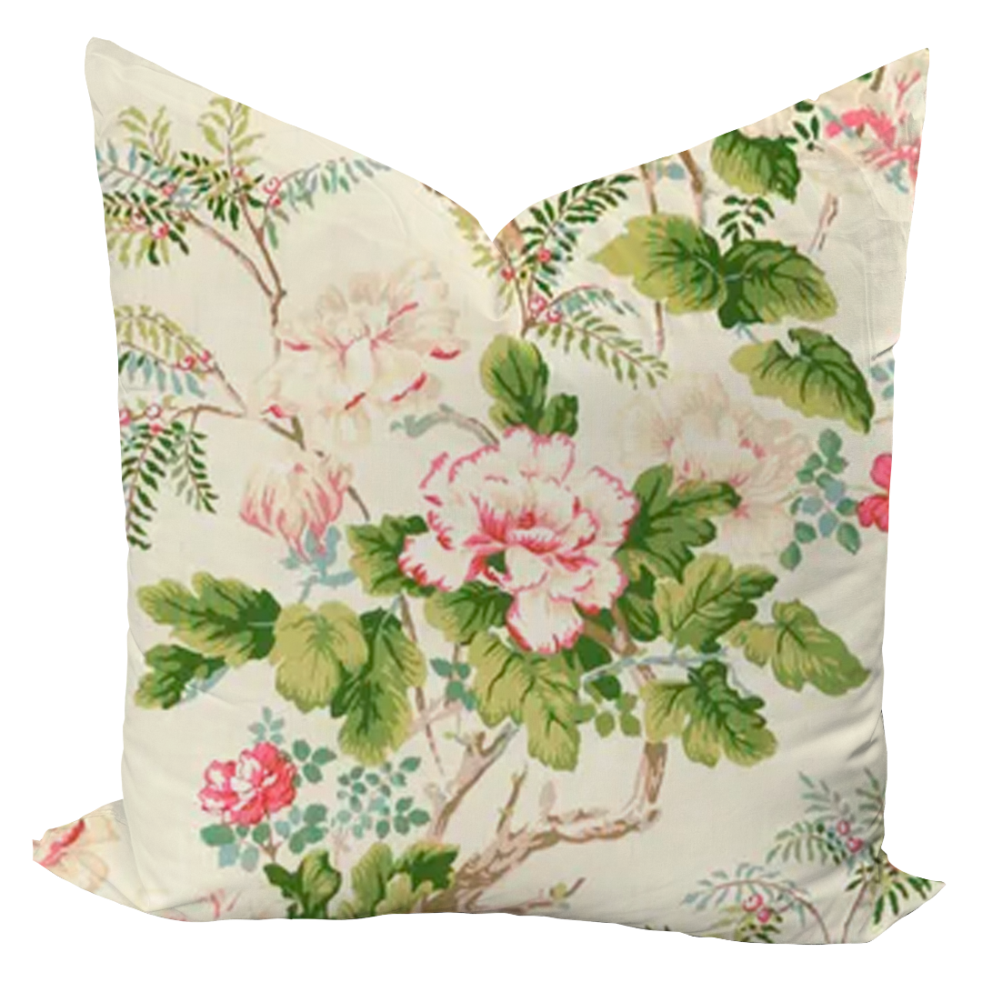 One decorative pillow cover featuring a floral print on home decor weight fabric by Lee Jofa.