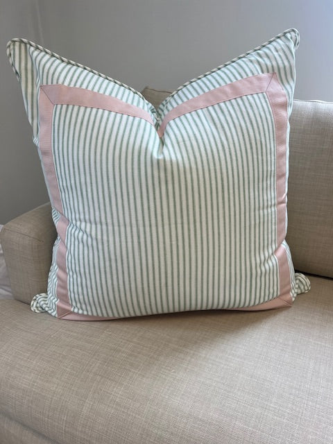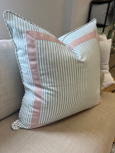 You just can't beat a classic ticking stripe! It's a great alternative to a solid fabric and we love it accented with a tape as a square accent.