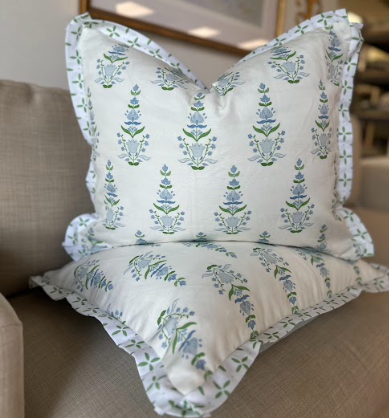 This is Ellie by Kristen Leigh, we pair it with Folly in Moss as the flange, and WWH's Ellie in light blue on the reverse. Covers will use 22" inserts (completed around 20x20).