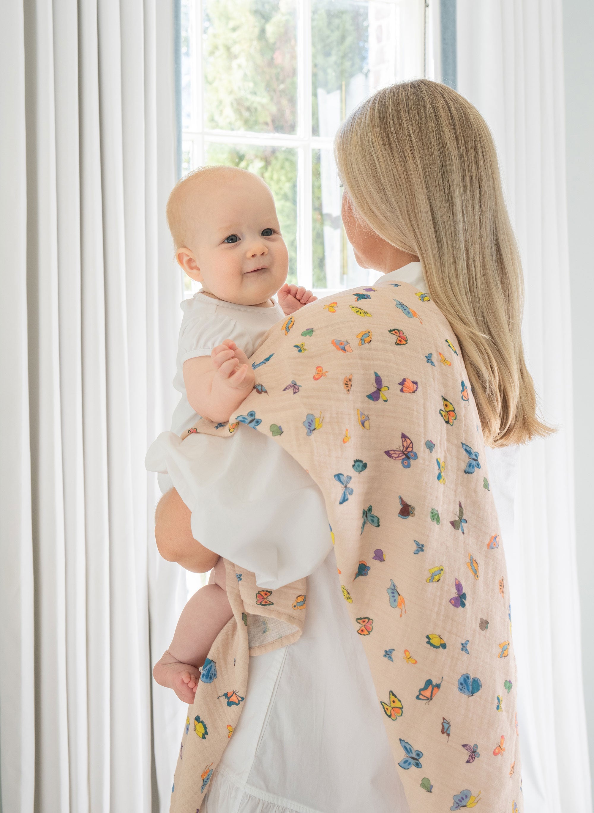 This is it: that versatile item that can do just about everything. From swaddling your precious newborn to being casually thrown around your neck as a scarf, our Shawl Blanket will become your everyday, never-leave-home-without-it accessory that will keep you and baby warm and cozy. (And don’t worry, we won’t tell your little one that you keep raiding her closet!) Deliciously soft 100% organic cotton.