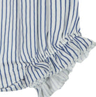 A sweet and delicate ruffled sleeve romper with adjustable straps and snap bottom closure.