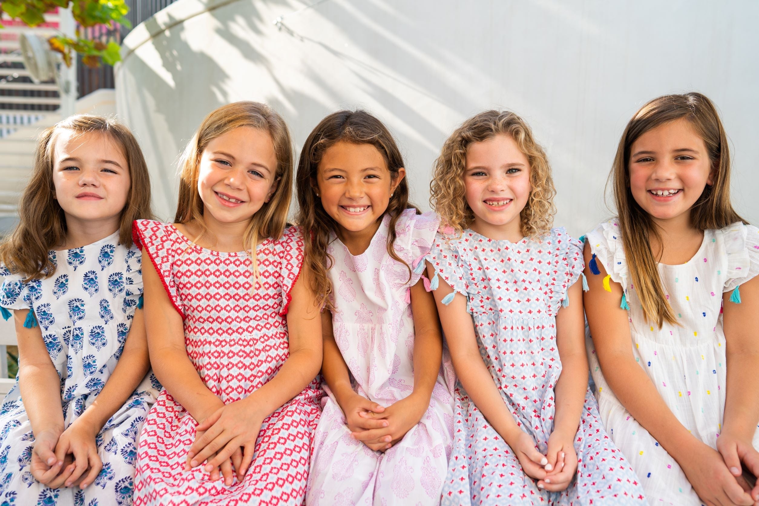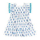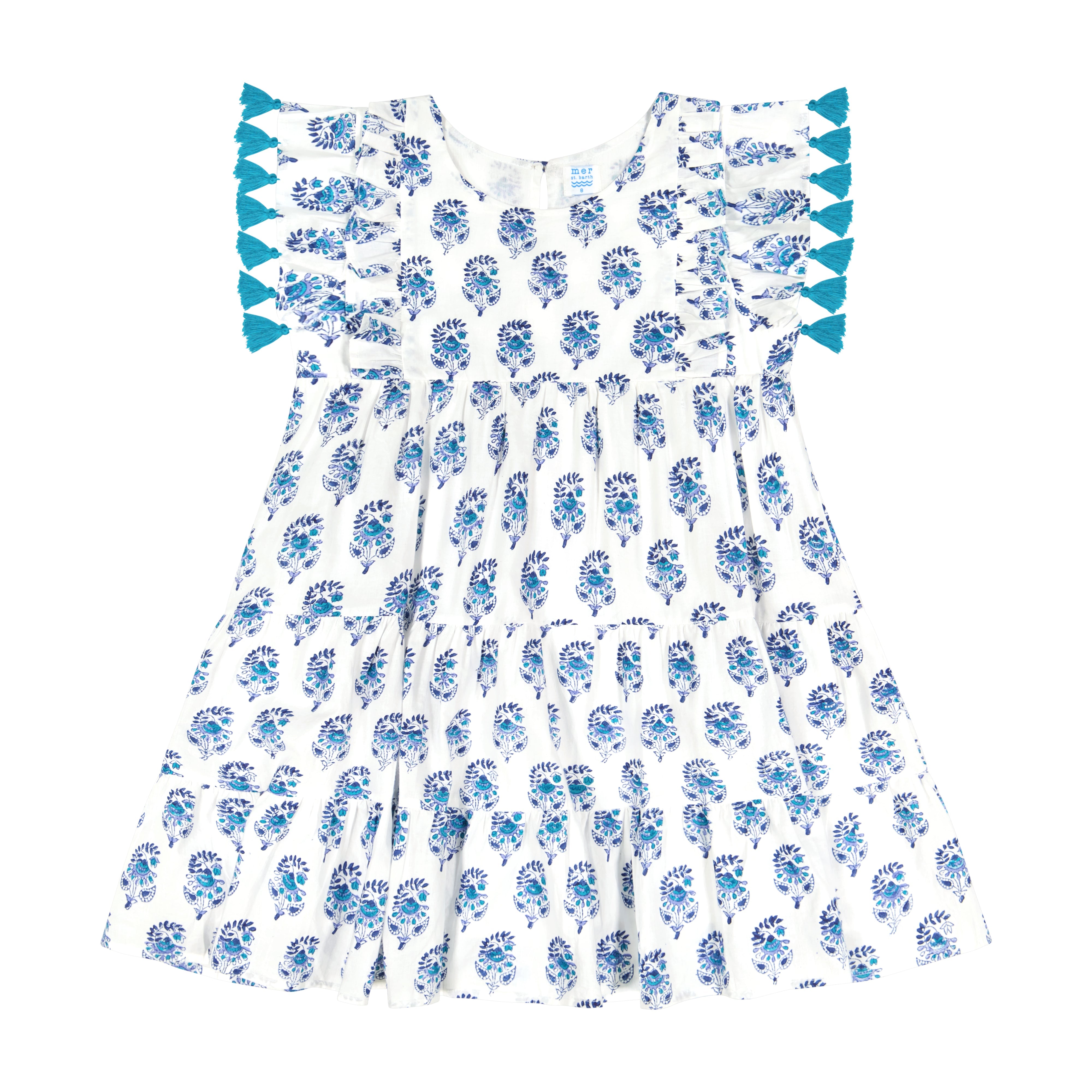 Beloved Sophie tassel dress features a scoop neckline, row of tassels at sleeves and tiered twirly skirt.