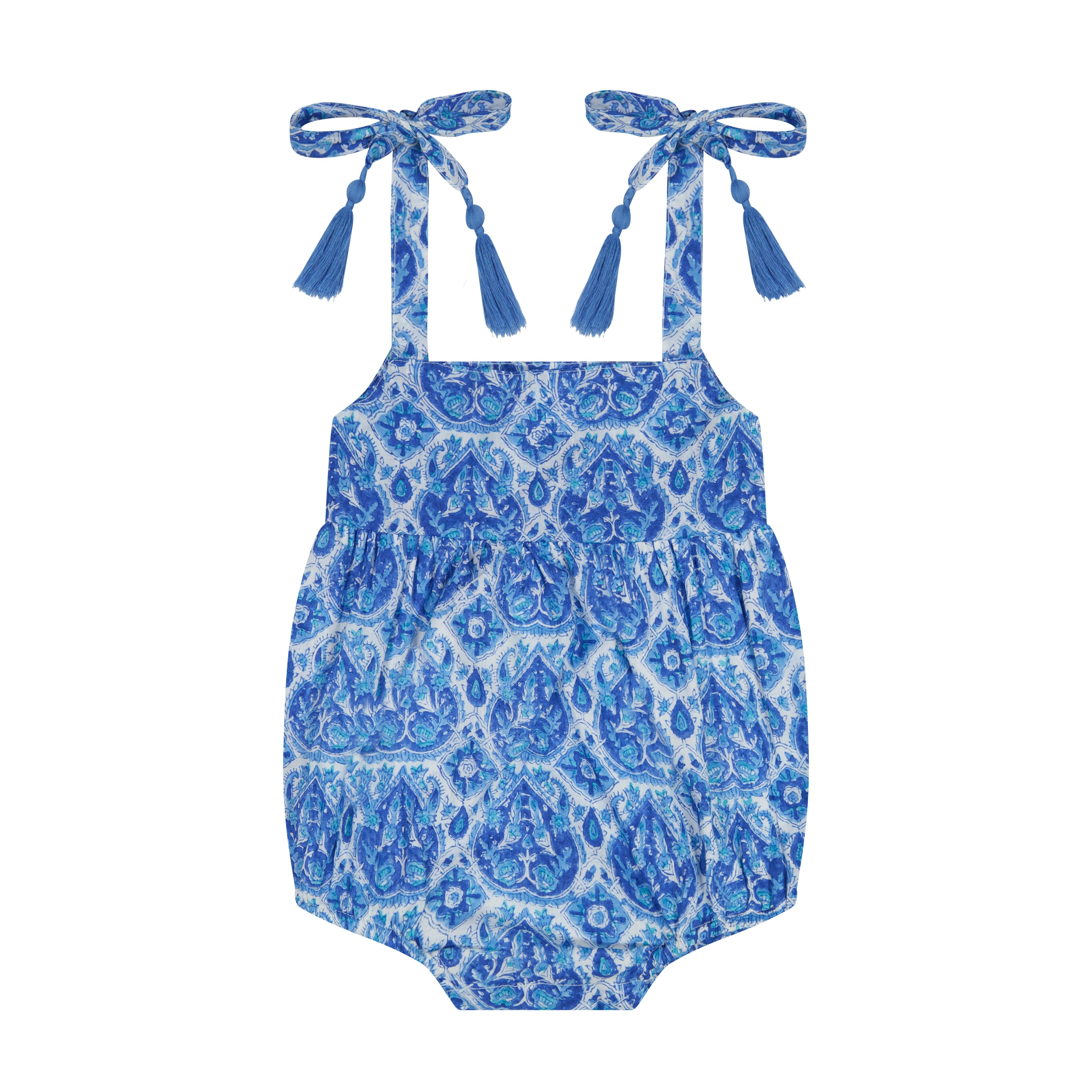 Sweet shoulder tie with tassel detailing make the Zoe romper an endless summer staple for your little.