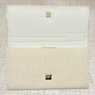This clutch is made from a beautiful, textured Thibaut grasscloth and features an embroidered tape across the front. The inside of the clutch is lined with white linen, and contains accordion sides with grommets for a removable chain (included). Click the "Customize Your Bag" button below to see decorative hardware options, and choose your favorite! Overall dimensions are 10” x 5” with a magnetic snap closure.