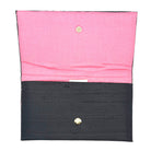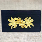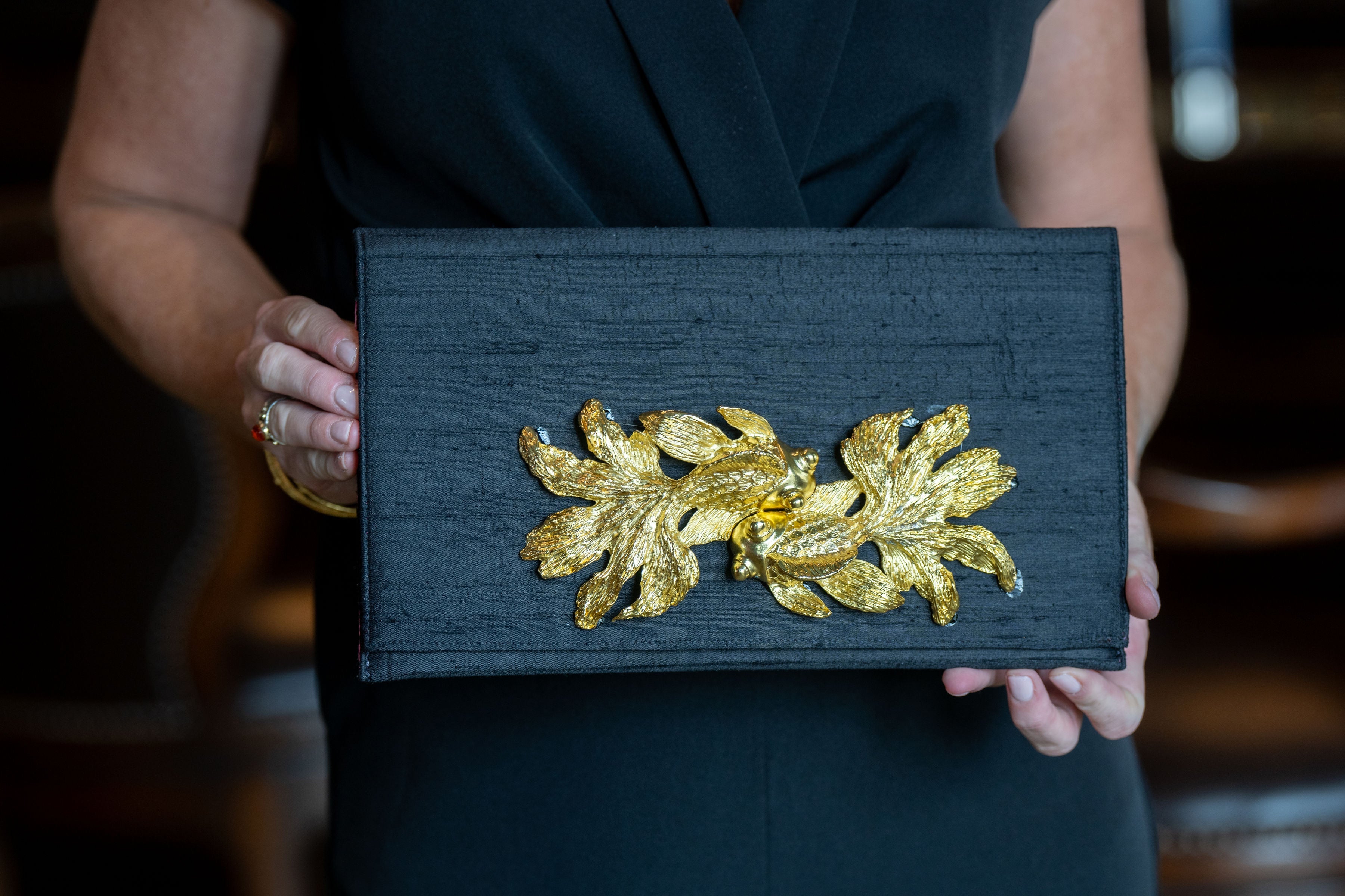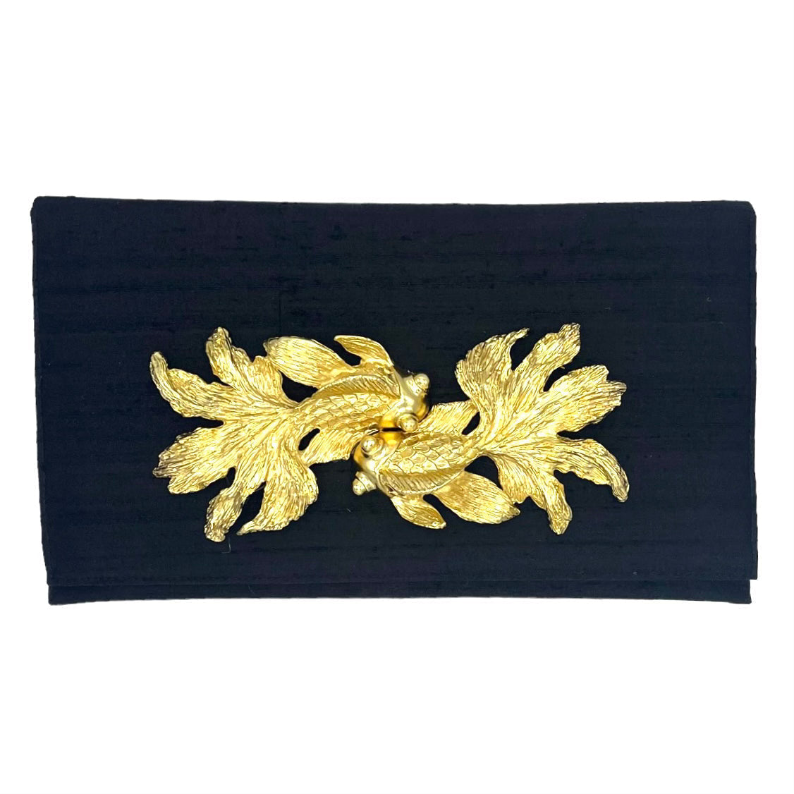This is a jaw-dropping pair of intertwined golden koi fish atop a black Dupioni silk clutch. The inside of the clutch is lined with pink linen, and contains accordion sides with grommets for a removable chain (chain is sold separately). Overall dimensions are 12” x 7” with a magnetic snap closure.