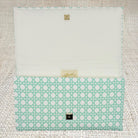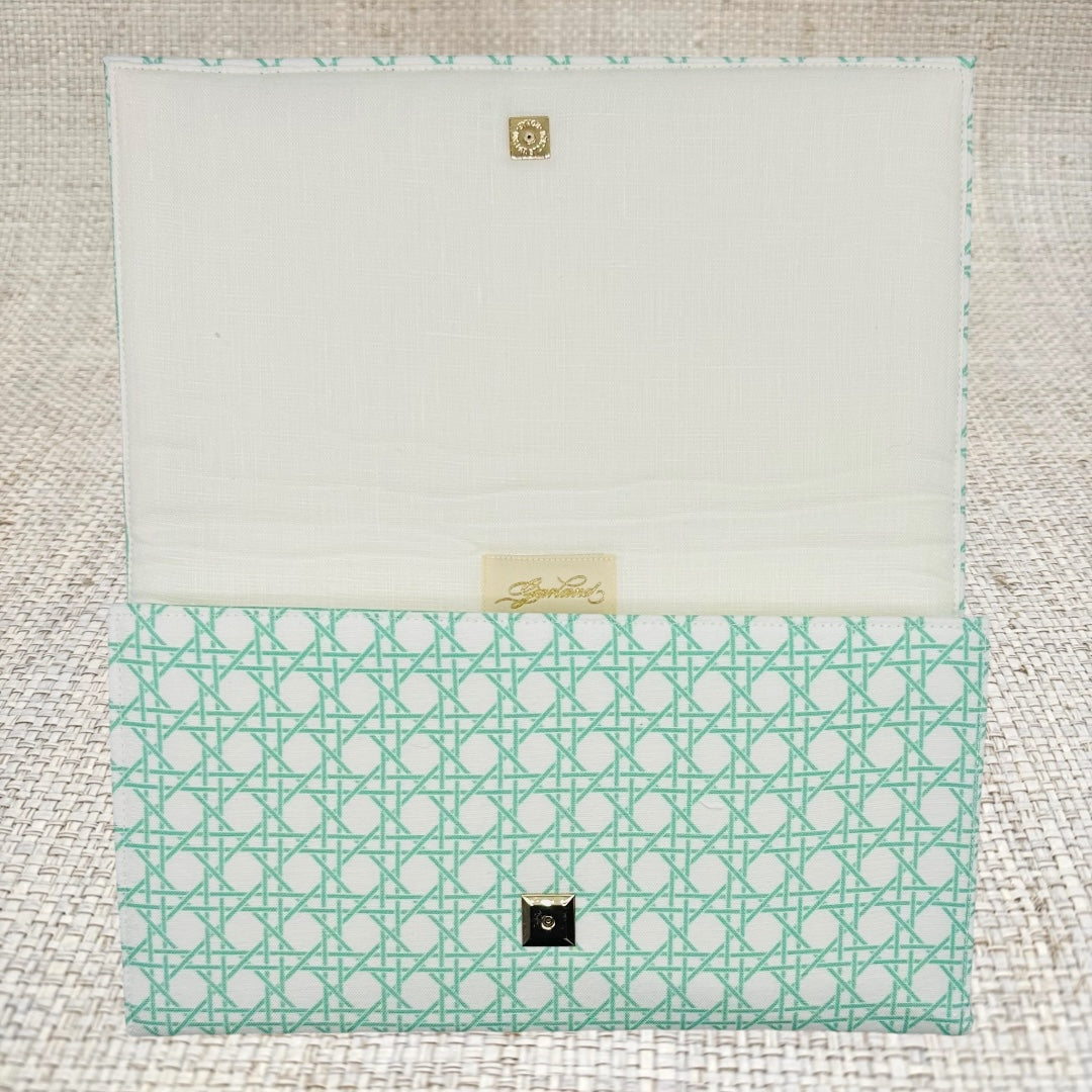 The inside of the clutch is lined with white linen and it topped with a gold, XX bamboo hardware piece. It contains accordion sides with grommets for a removable chain (chain is sold separately). Overall dimensions are 12” x 7” with a magnetic snap closure.
