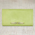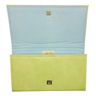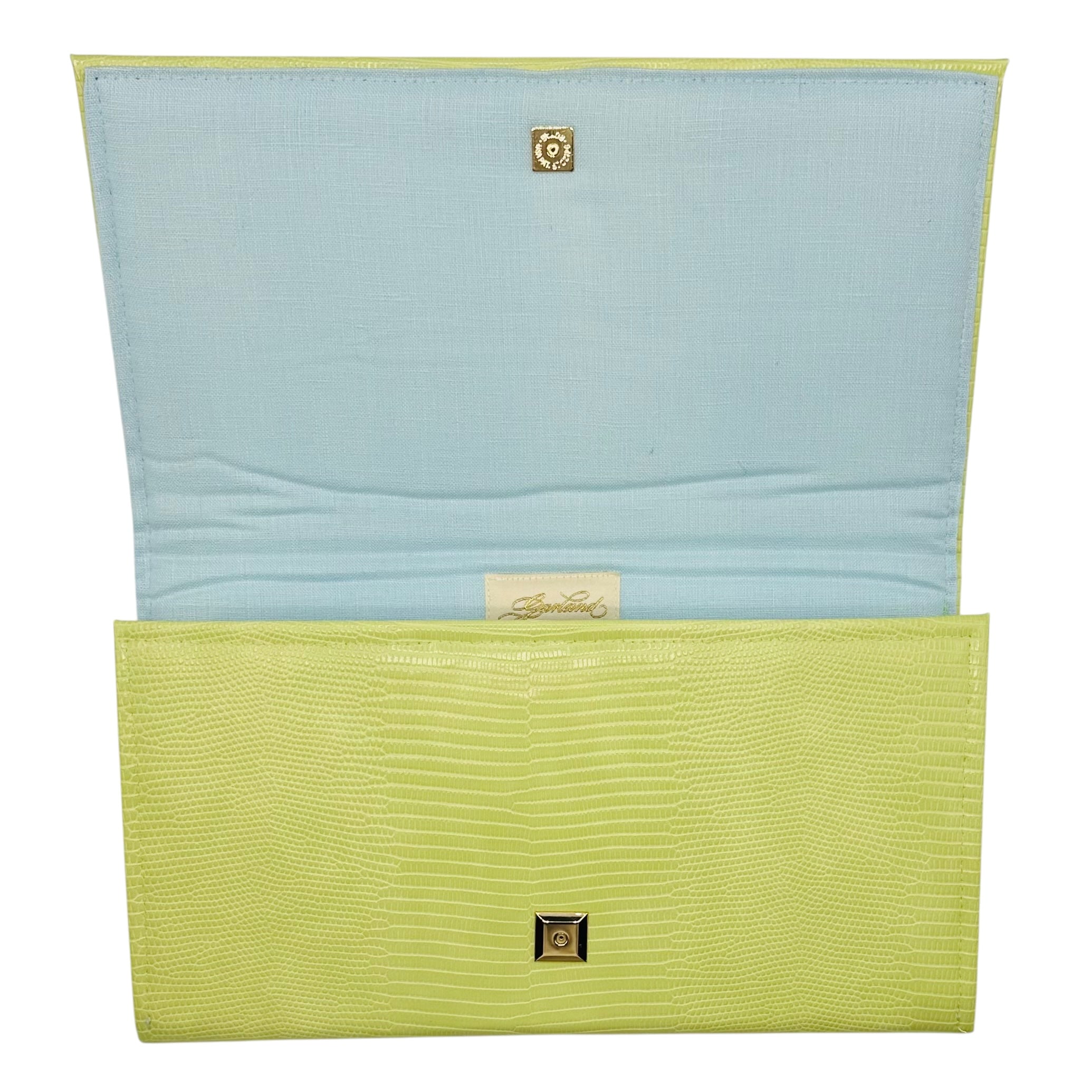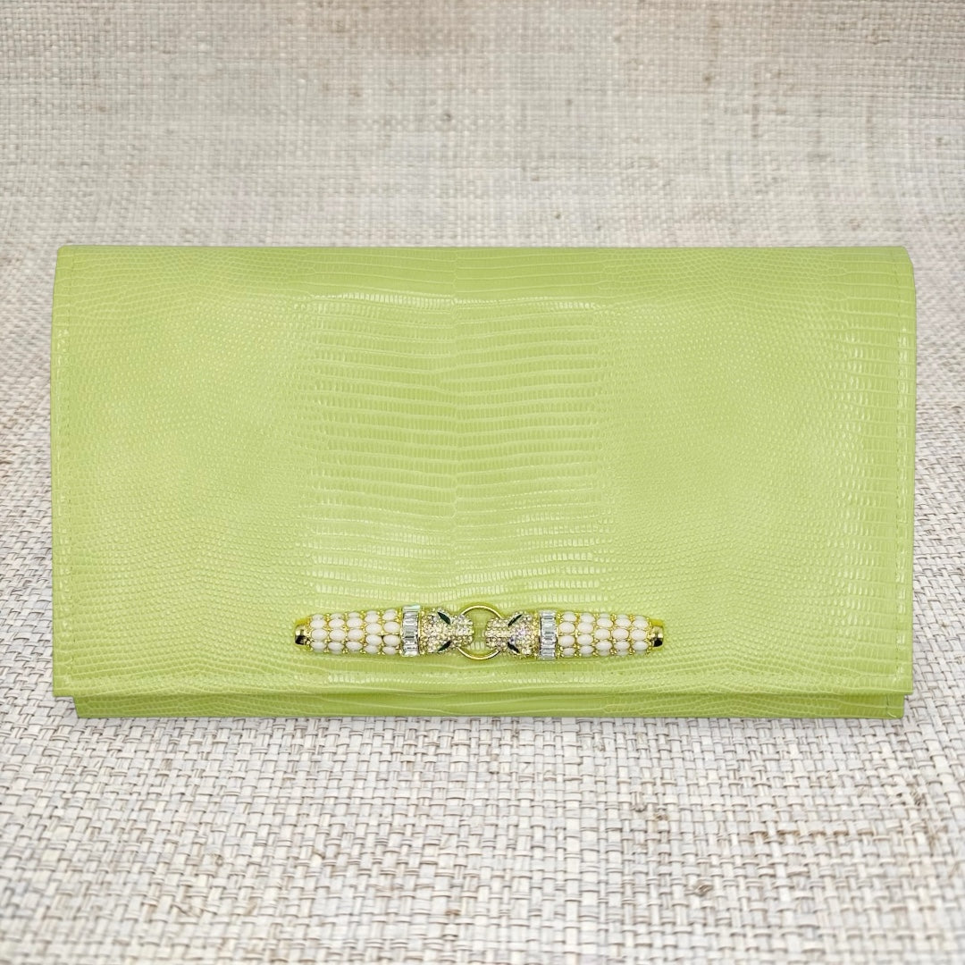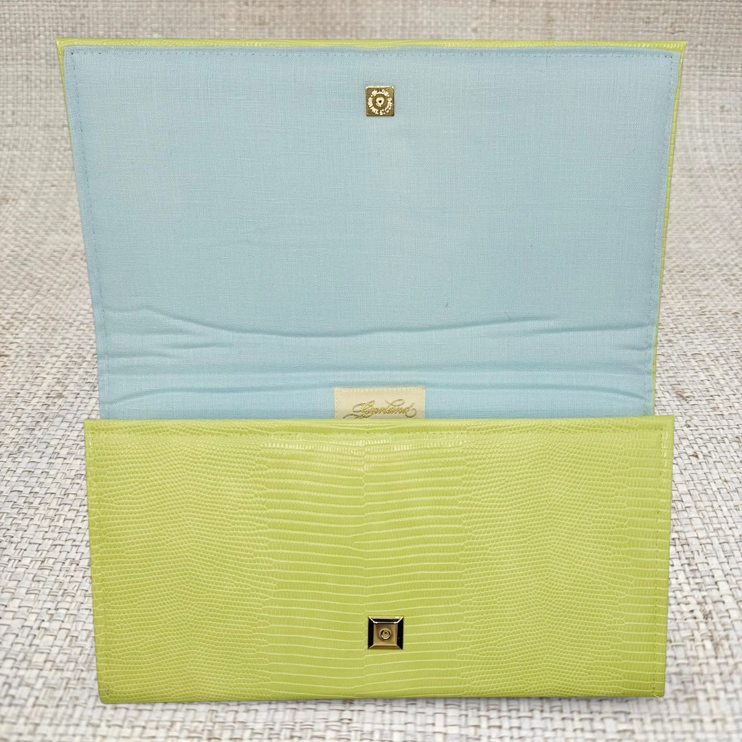 Lucy is made with a delectable, faux lime serpent hide. The interior is lined with Tiffany blue linen, and contains accordion sides with grommets for an optional chain (chain sold separately). Click the "Customize Your Bag" button below to see decorative hardware options, and choose your favorite! Overall dimensions are 12” x 7” with a magnetic snap closure.