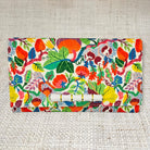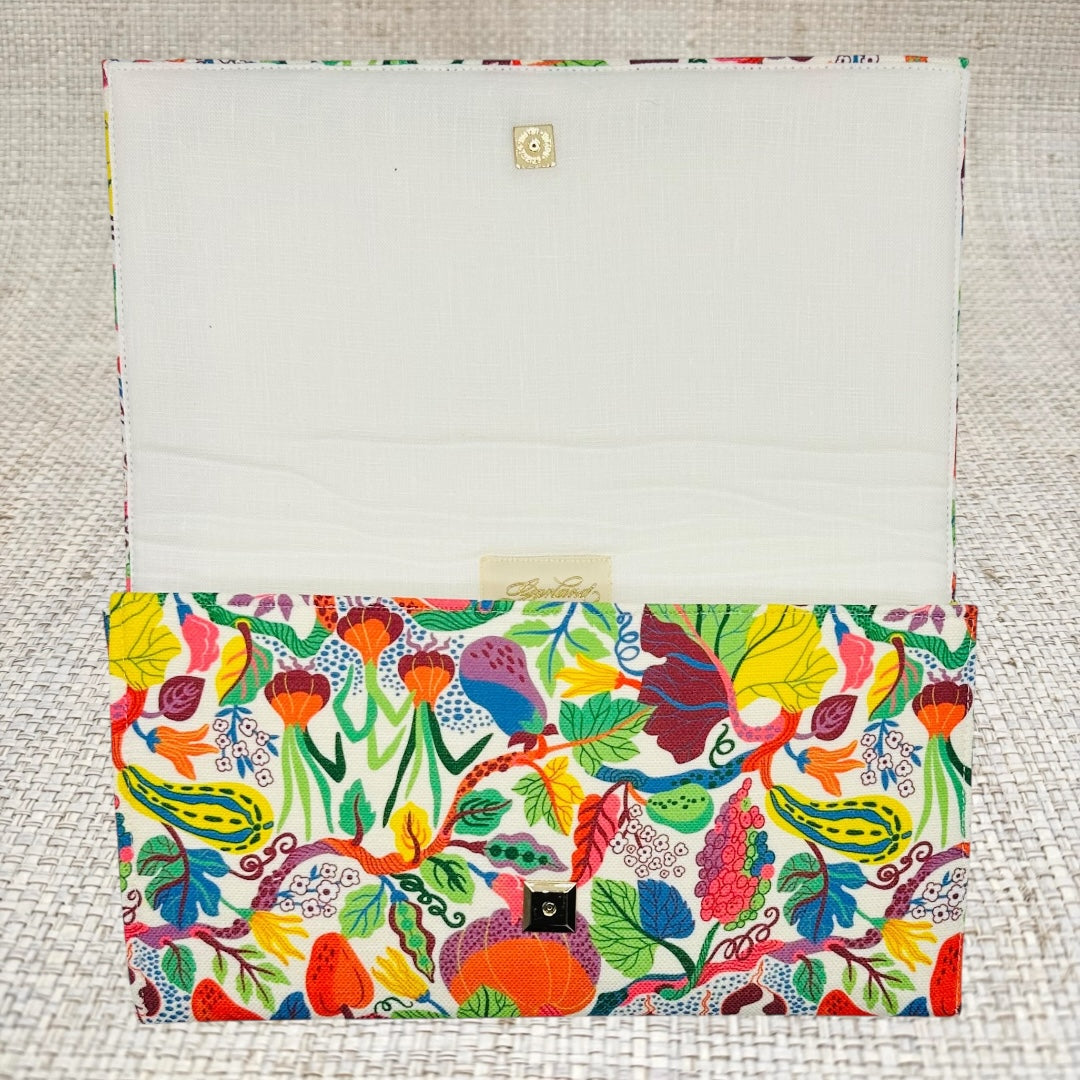 The inside of the clutch is lined with white linen and it topped with a white and gold bamboo hardware piece. It contains accordion sides with grommets for a removable chain (chain is sold separately). Overall dimensions are 12” x 7” with a magnetic snap closure.