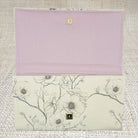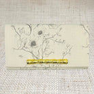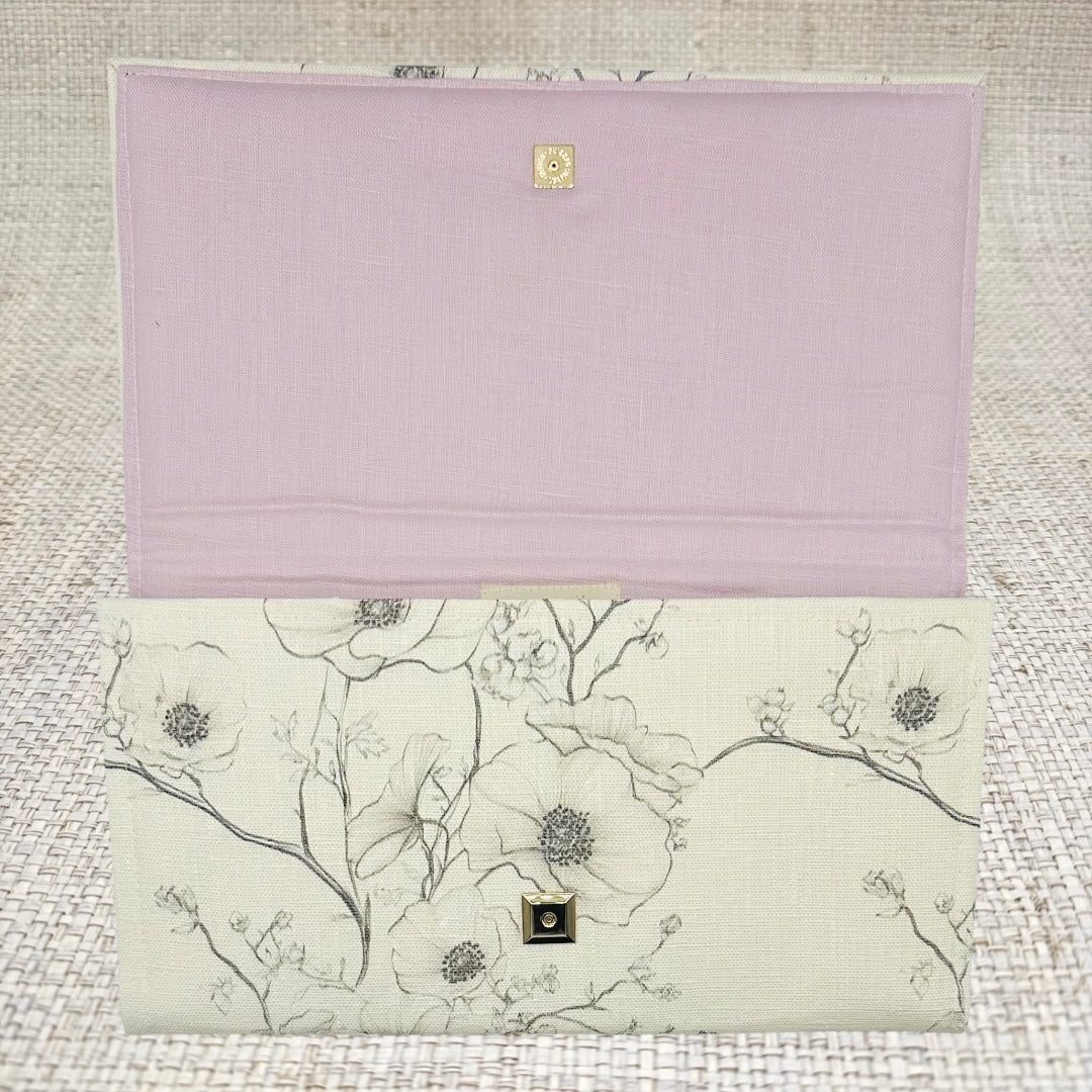 The inside of the clutch is lined with lavender linen, and contains accordion sides with grommets for a removable chain (chain is sold separately). Click the "Customize Your Bag" button below to see decorative hardware options, and choose your favorite! Overall dimensions are 12” x 7” with a magnetic snap closure.