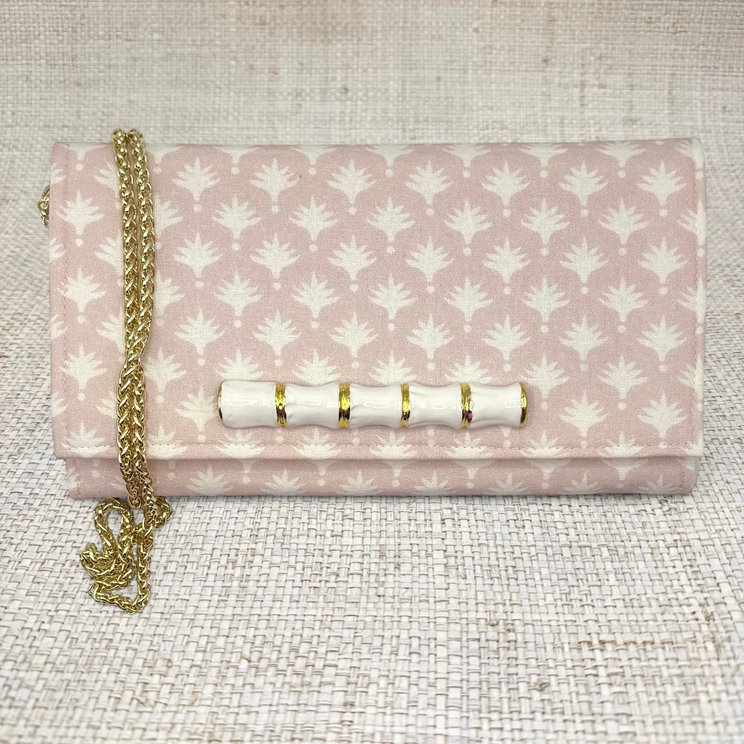 The inside of the clutch is lined with white linen, and contains accordion sides with grommets for a removable chain (chain is included). Click the "Customize Your Bag" button below to see decorative hardware options, and choose your favorite! Overall dimensions are 10” x 5” with a magnetic snap closure.