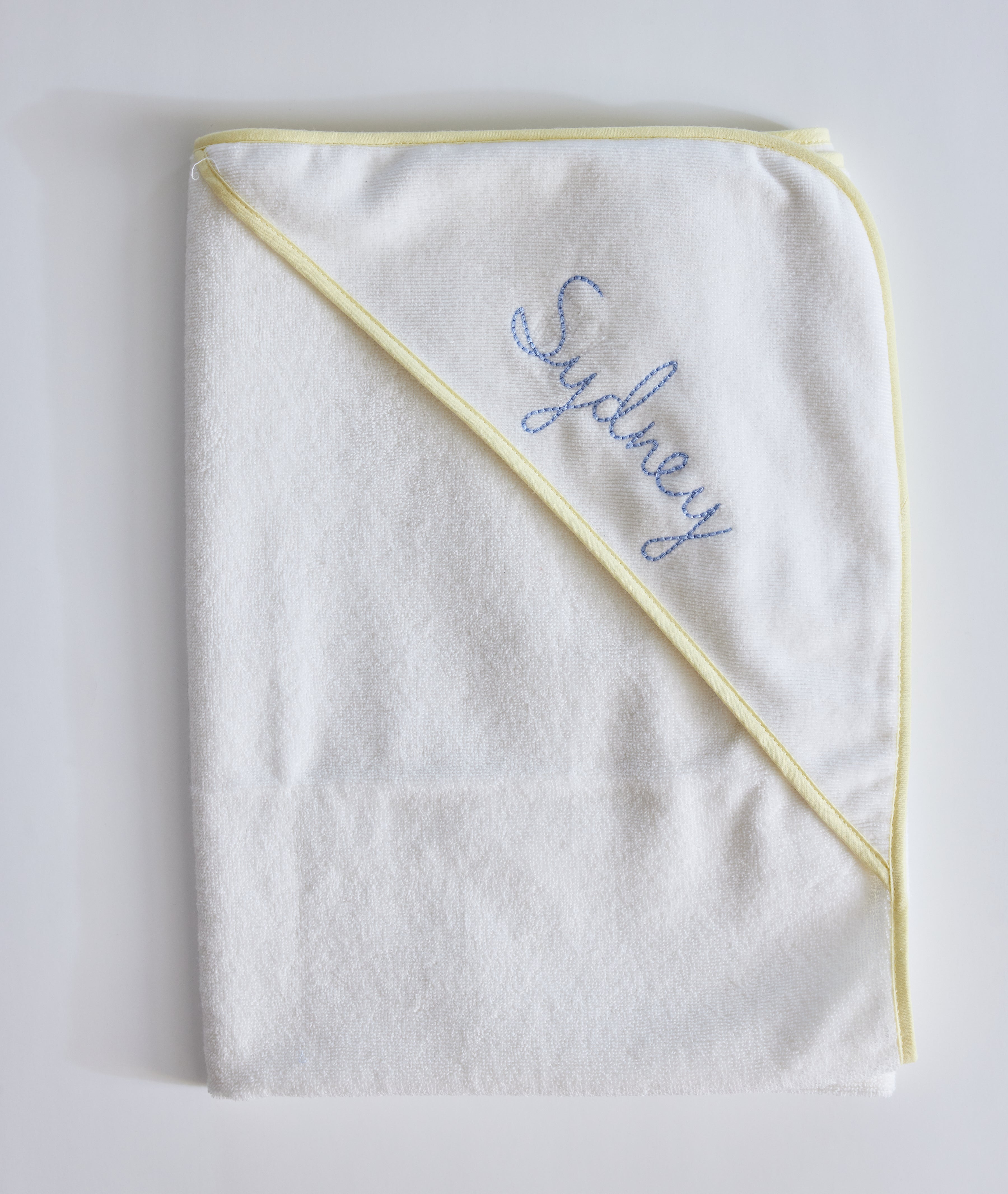 Only the softest for delicate newborn skin. Our sublime white cotton terry hooded bath towel and matching washcloth is perfect for babies, perfect as a baby gift. Make it even more special by personalizing it with a name or monogram. This set is finished with a lemon yellow binding.