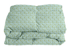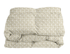 Comforters are made from a cotton/linen blend or sateen cotton material with polyester batting inside. The weight is all season & perfect year round.