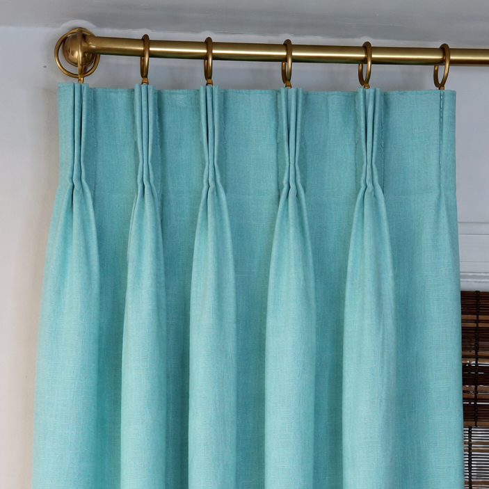Drapes are finished with 4" header with buckram, 5 pleats and a 3.5" return and overlap. Each single width panel needs 7 rings and comes with pins set behind the pleat. (Adjusting the pin up or down can help lower or raise the panel a bit for slight adjustments as needed upon hanging). We always suggest waiting to hang drapery rods until the drapes are on hand, as it's easier to get the right placement/height when hanging the rod and drapery together.