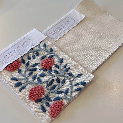 Embroidered Tape in Rose & Sky on Off White Cotton Drapery Panel (Soil & Stain Resistant)