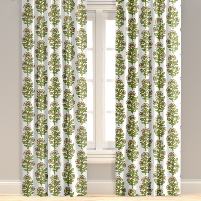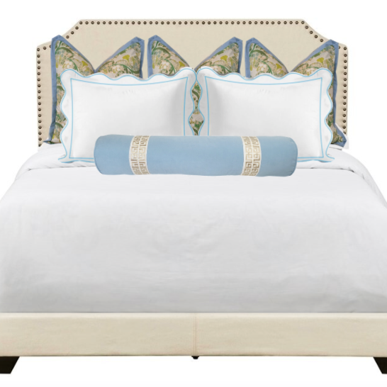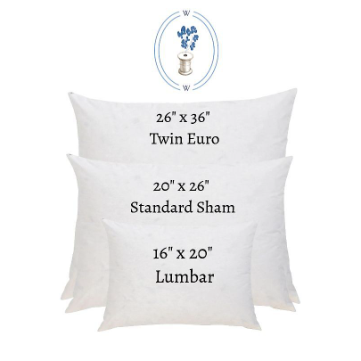 For this collection the setup depends on the bed size: Twin bed: 1 Kathryn King Euro (26x36) to fill the back of the bed, a single scalloped sham (20x26), then Megan Bolster (9x19 or 9x28). Full/Queen bed: 2 Kathryn Queen Euros (26x30), two scalloped standard shams (20x26), then Megan Bolster (9x38). King: 2 Kathryn King Euros or 3 26x26 Euros, 2 scalloped king shams (20x36), then Megan Bolster (9x38 or 48). For a light pink thread, use 91NL. For a green thread, use 735DD. Finish off the look with one of our many drapery options. If you need further help with putting this room together (paint color, wallpaper, rug, or any other furnishings), please email design@wheatonwhaleyhome.com.