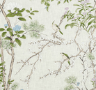 Airy and artistic, Katsura showcases gracious linework with fine vertical branches, blossoms, and birds.