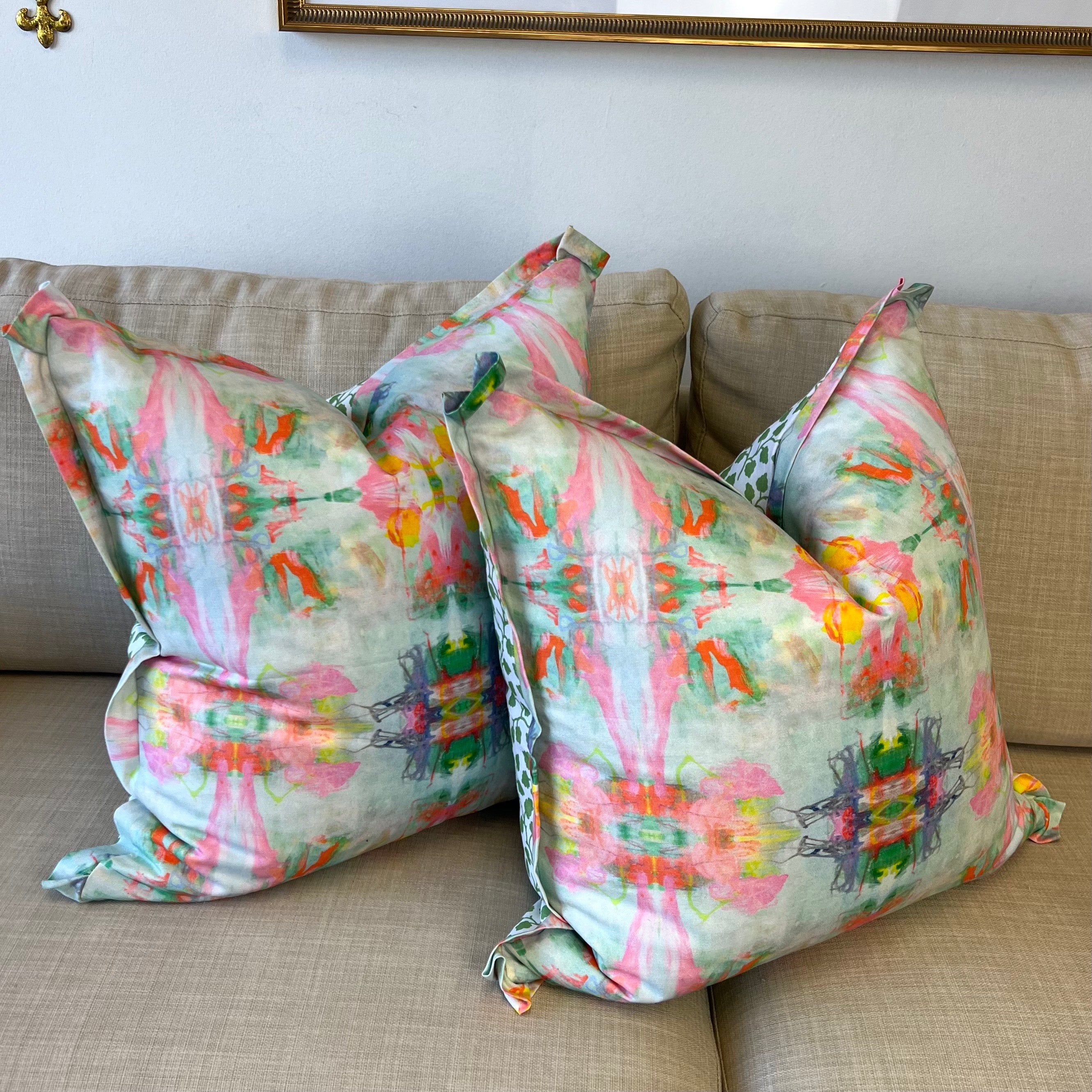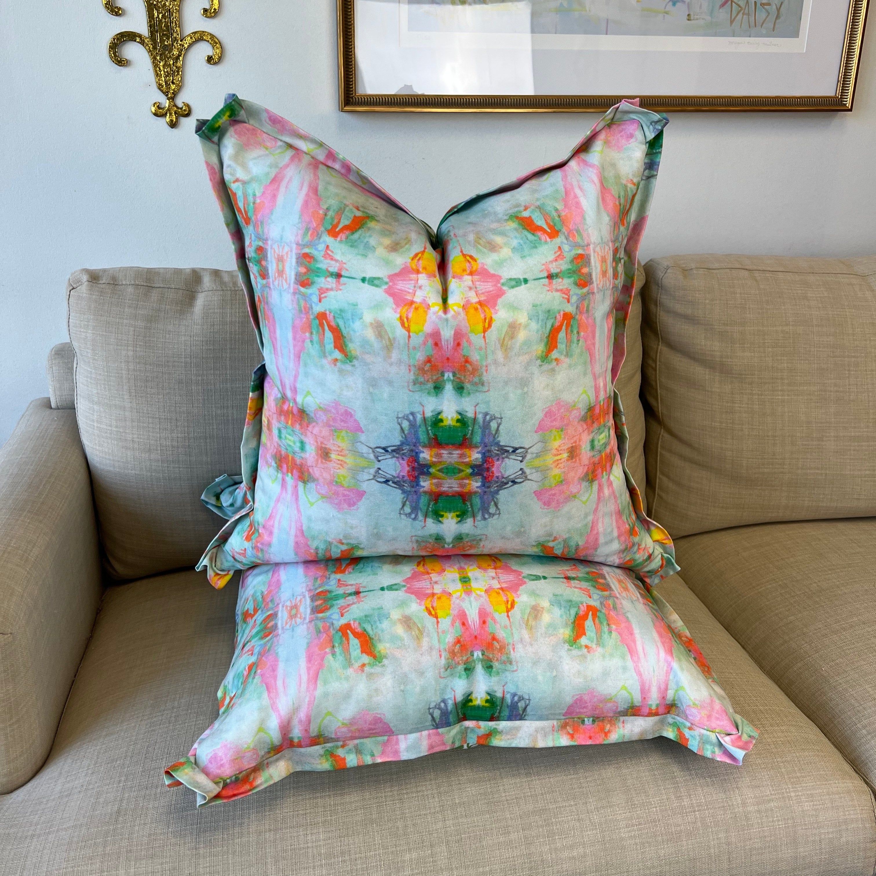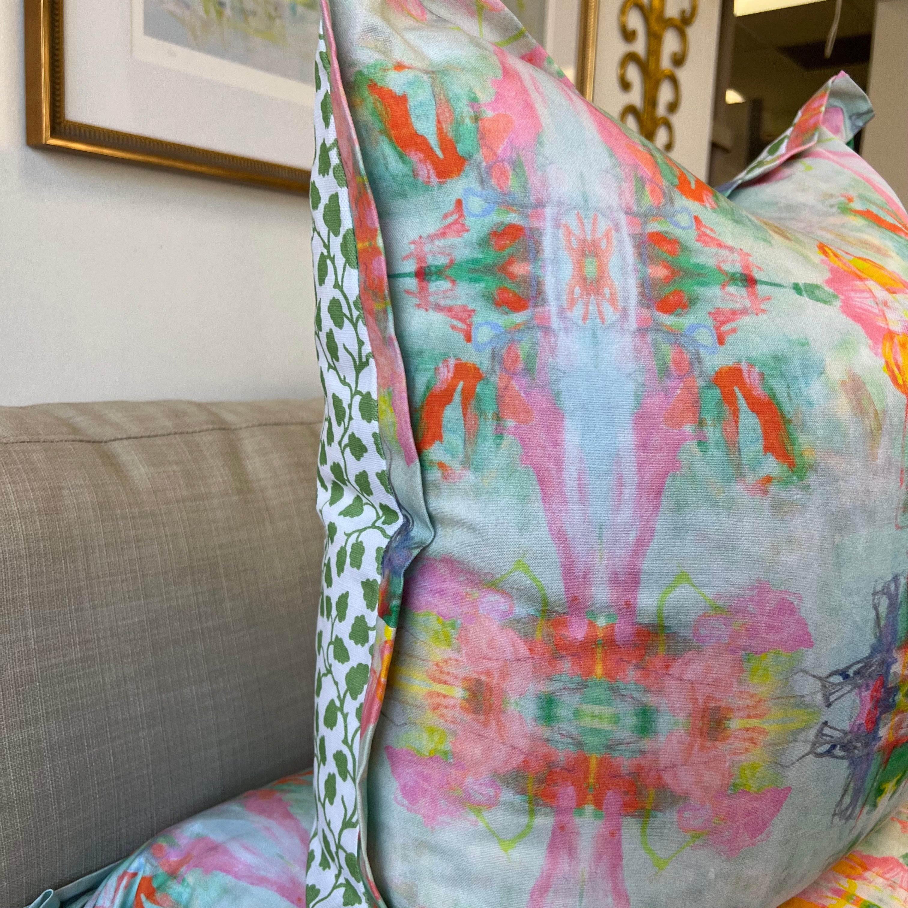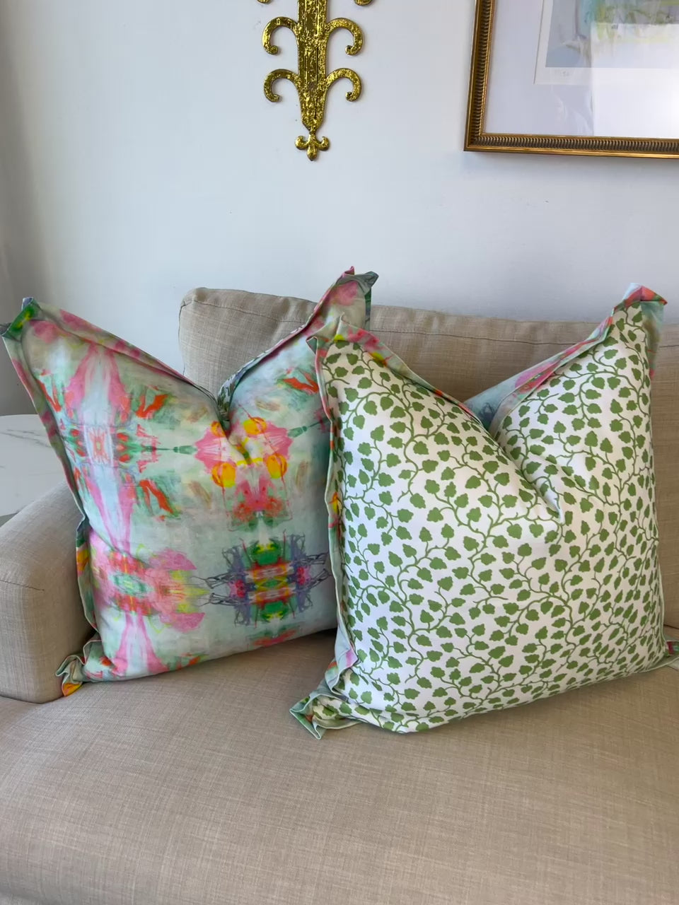 Placement of the pattern may vary from front to back & from pillow. Front of cover will feature Calliope by Cathy Lancaster with back and contrast finish in Audrey Lime (if you select contrast welt or flange).
