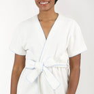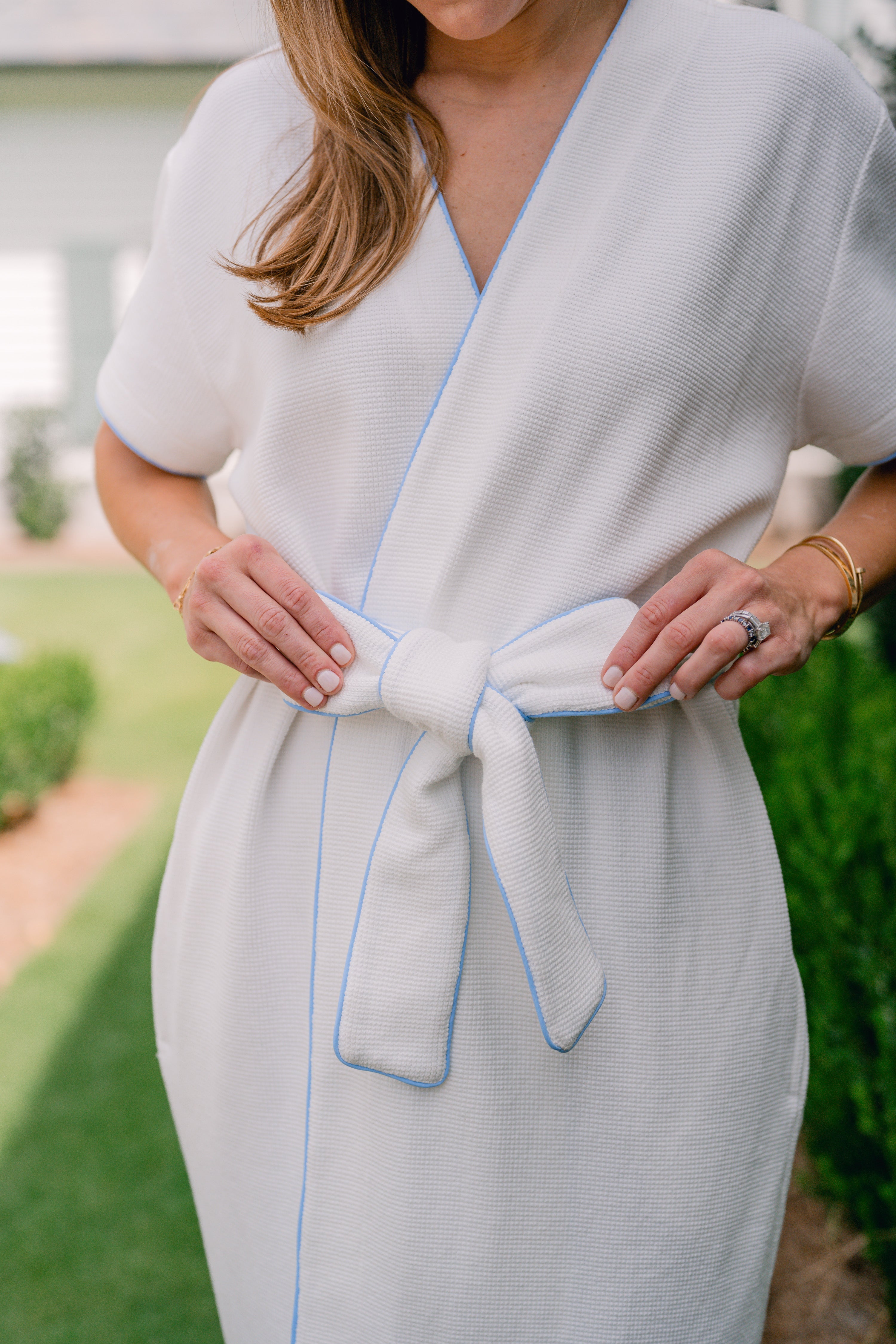 Experience the perfect balance of beauty and comfort with the Shannon Robe. Made from fine pique waffle fabric, this classic short-sleeve robe offers a touch of elegance in every detail. Piped in a cheery blue, the robe features a flattering cut that hits just below the knee, with a wide, coordinating belt to cinch the waist. Designed with convenient pockets and an interior tie for added security, the Shannon Robe combines practicality with luxurious comfort, making it an essential addition to your daily routine.