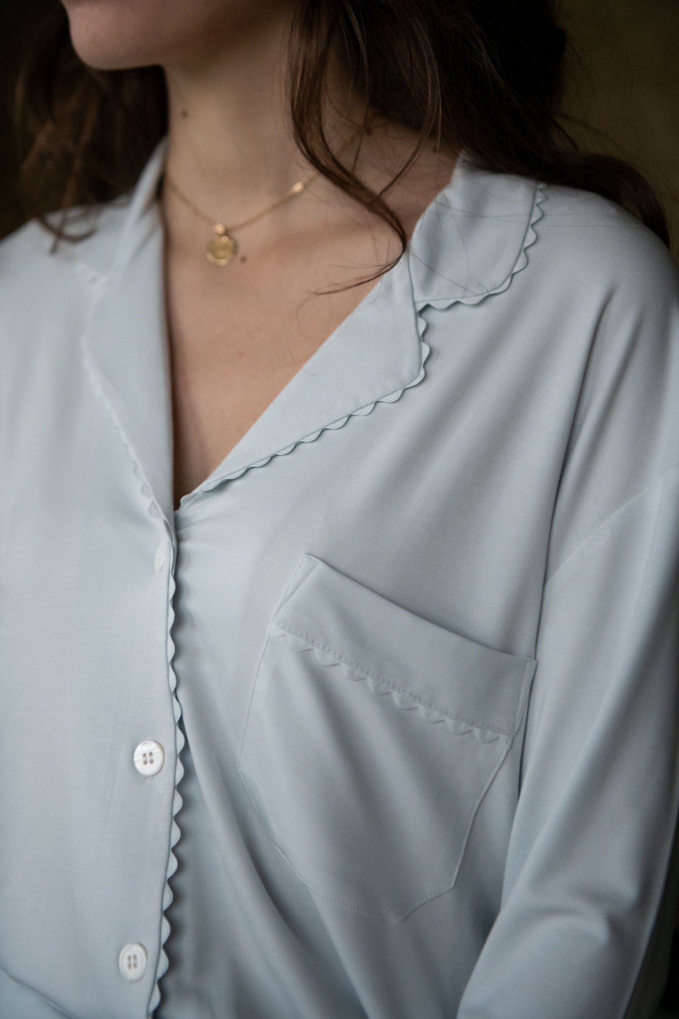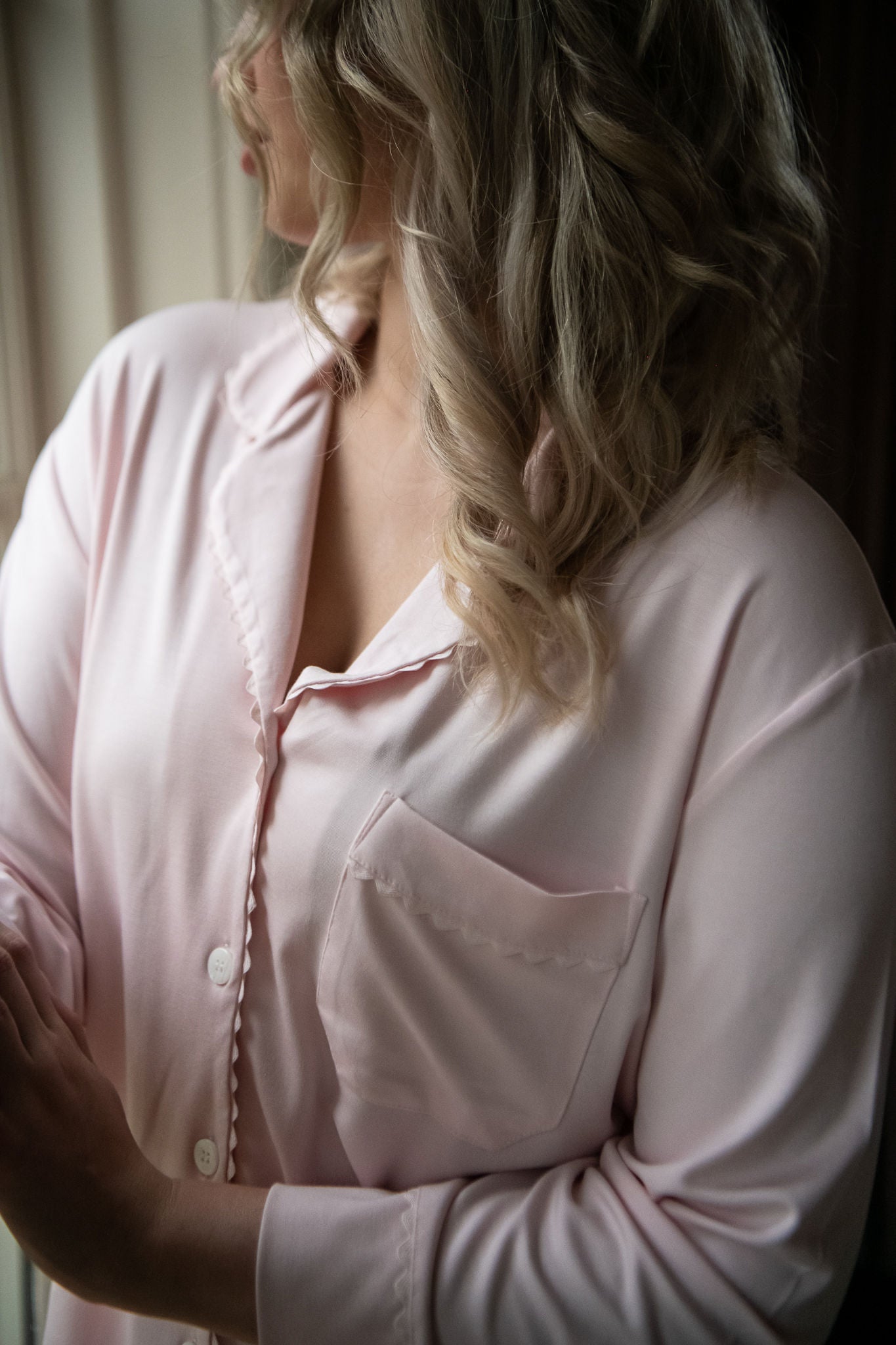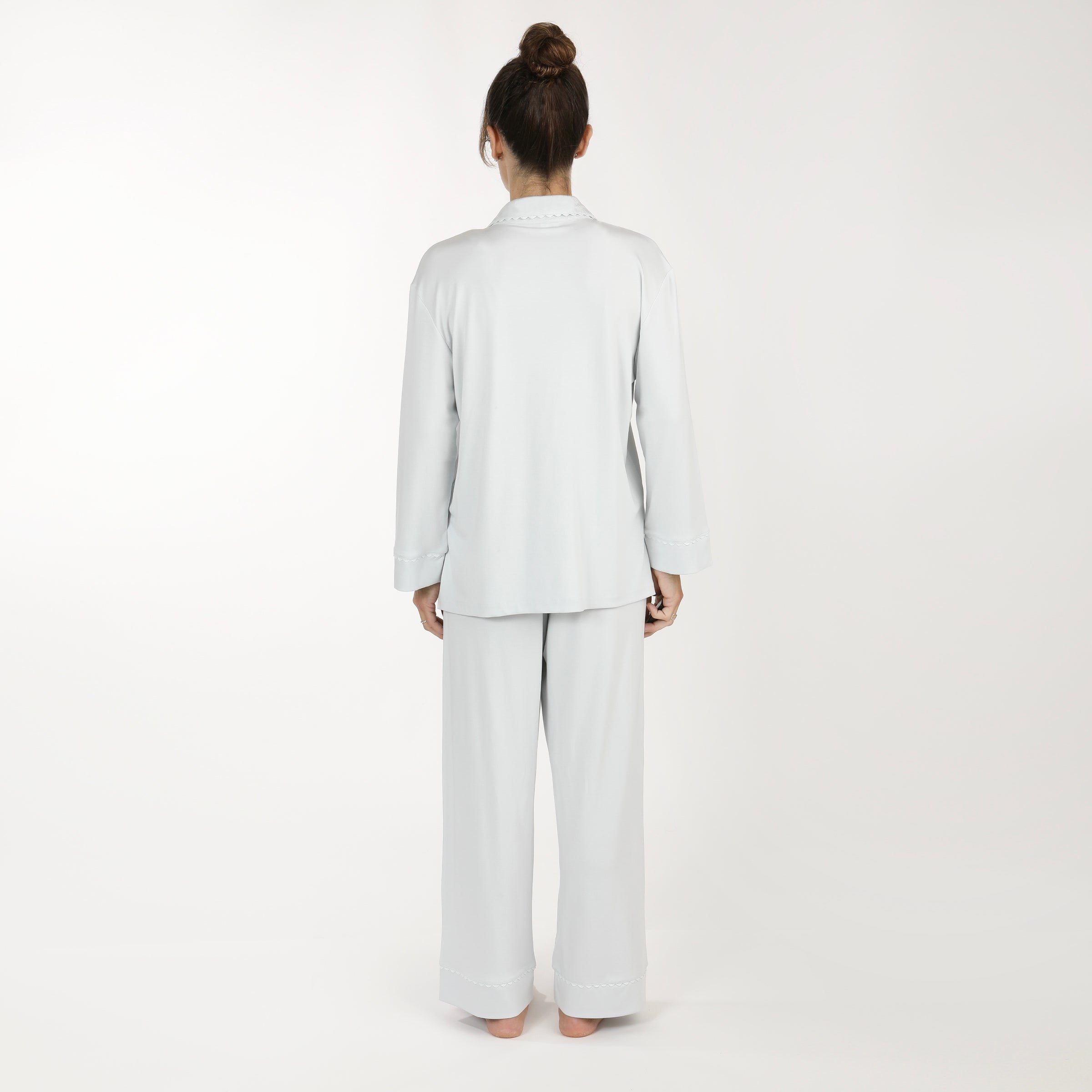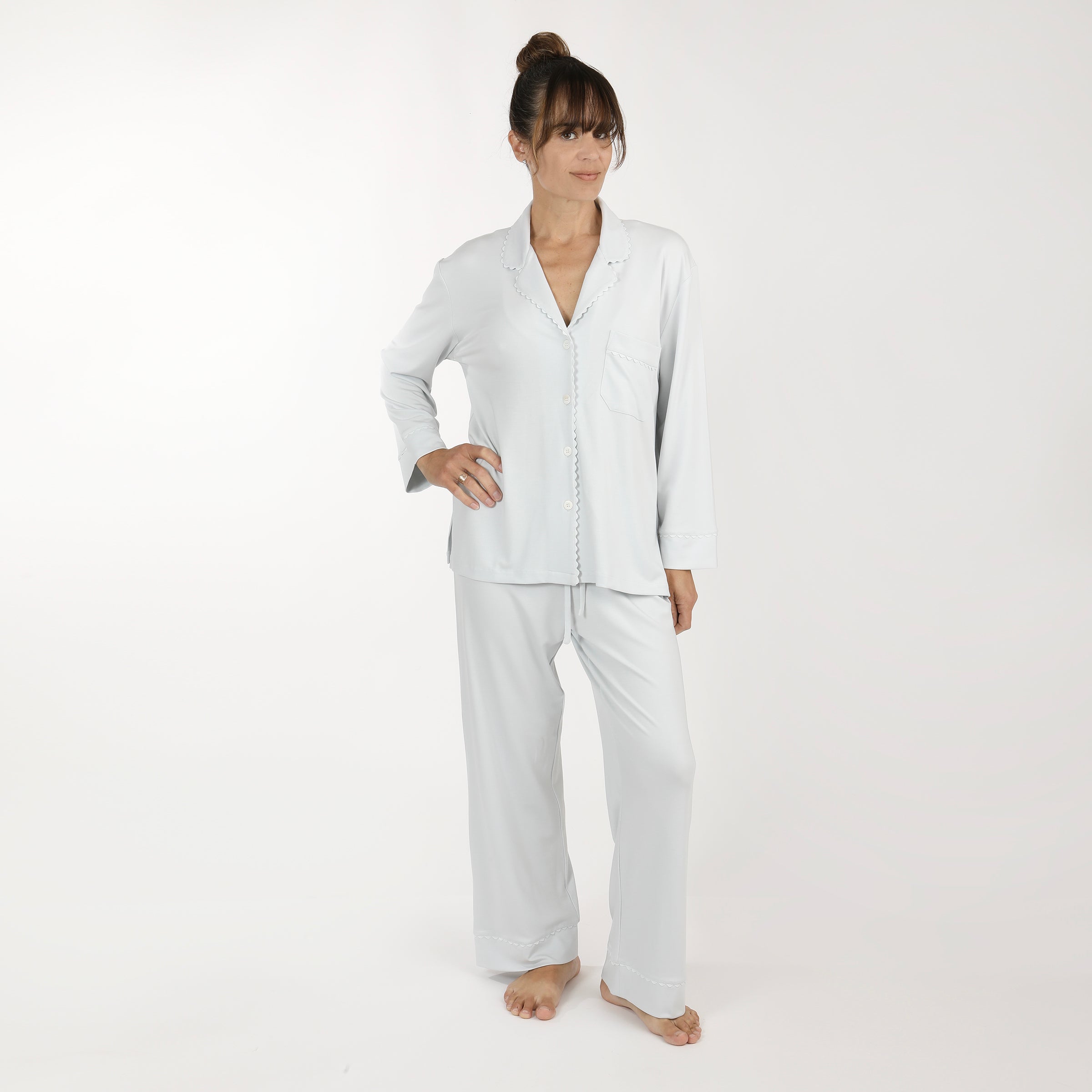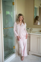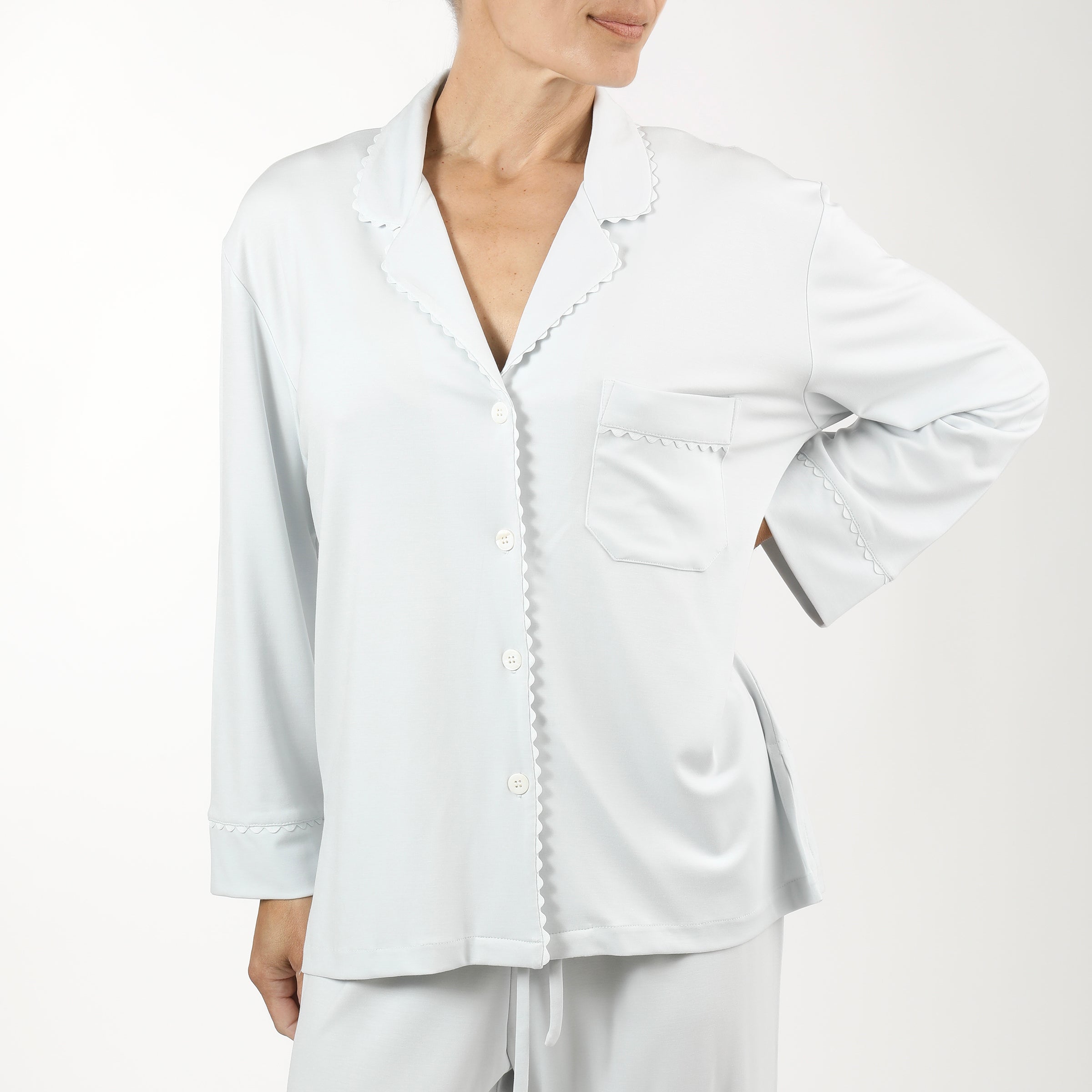 Elevate your relaxation routine with the Wynne Modal Pajamas. Crafted from luxurious modal knit, these pajamas offer an irresistibly soft feel that drapes beautifully and washes well without shrinkage. The set features a button-front top with matching ric rac trim and a convenient front pocket, blending classic style with practical design. The pants, equipped with a comfortable drawstring and elastic back, ensure a perfect fit for a restful night's sleep.