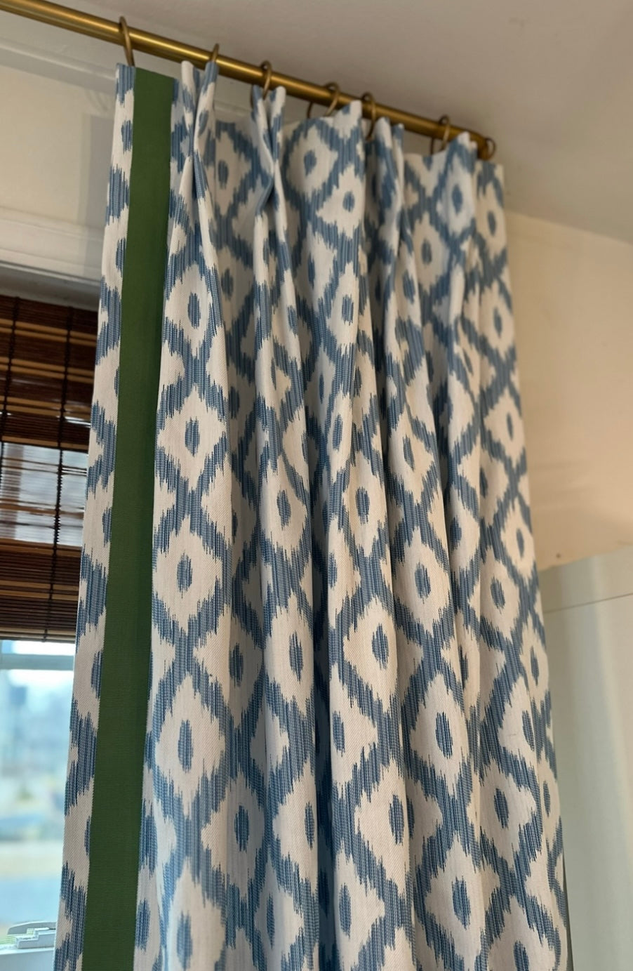 Drapes are finished with 4" header with buckram, 5 pleats and a 3.5" return and overlap. Each single width panel needs 7 rings and comes with pins set behind the pleat. (Adjusting the pin up or down can help lower or raise the panel a bit for slight adjustments as needed upon hanging). We always suggest waiting to hang drapery rods until the drapes are on hand, as it's easier to get the right placement/height when hanging the rod and drapery together.