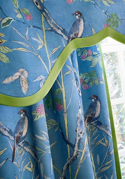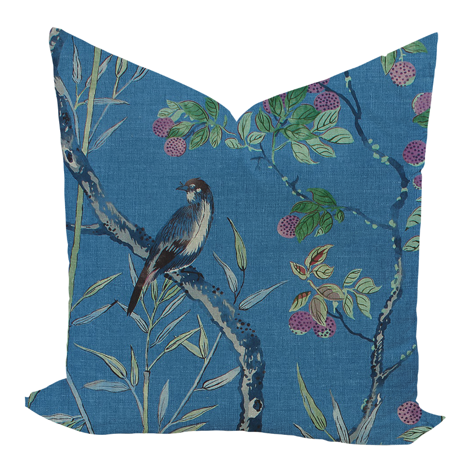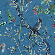 Small birds and butterflies nestle amongst climbing tree branches, delicate bamboo leaves, and lychee fruit. An open and airy design, Claire is an elegant choice in fabric and wallcovering, offered in background colors ranging from subtle neutrals to punchier blue. This pattern is also available in wallpaper!