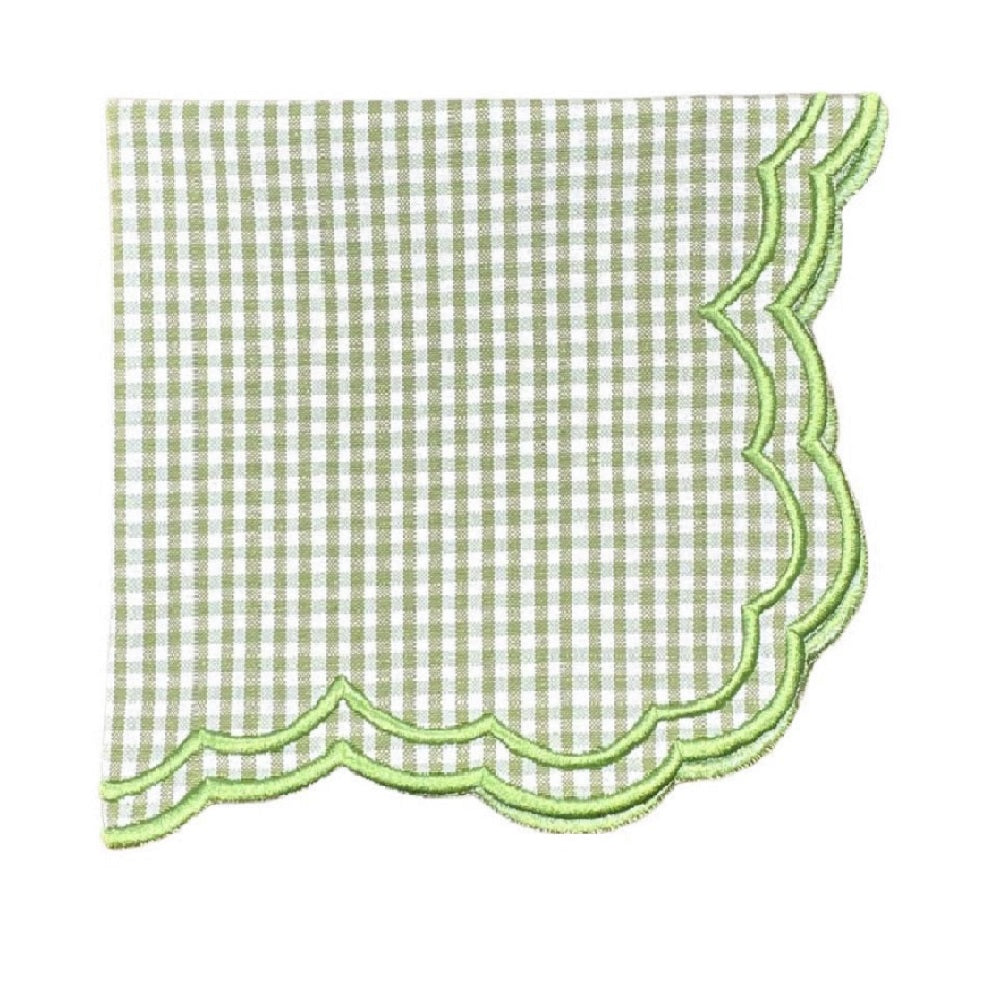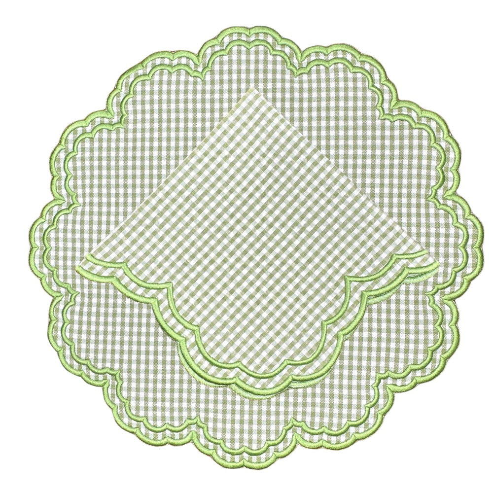 Brighten your table with our delightful light green gingham Bettina Napkins, beautifully adorned with light green wavy scalloped embroidery. This timeless design brings charm to every dining occasion.