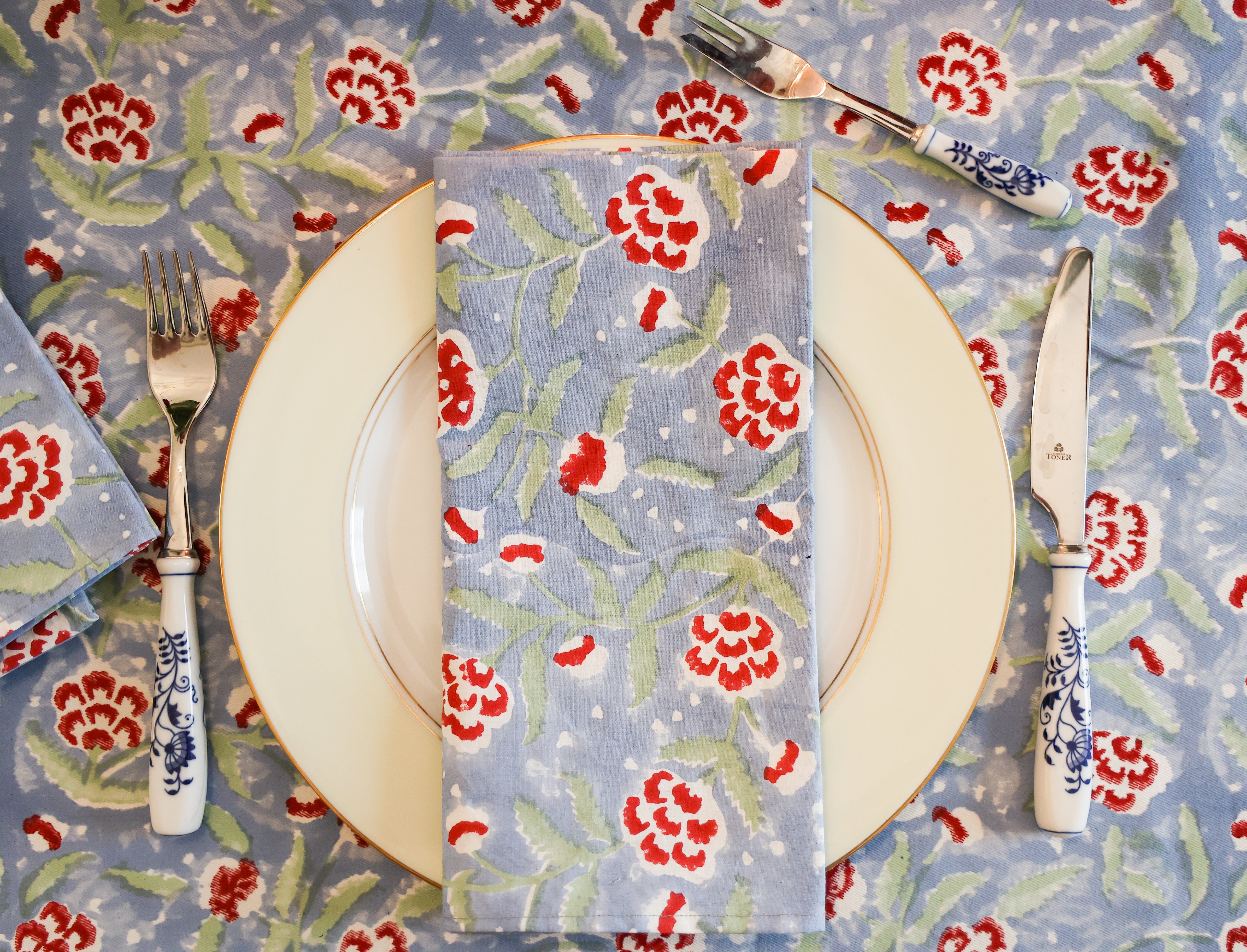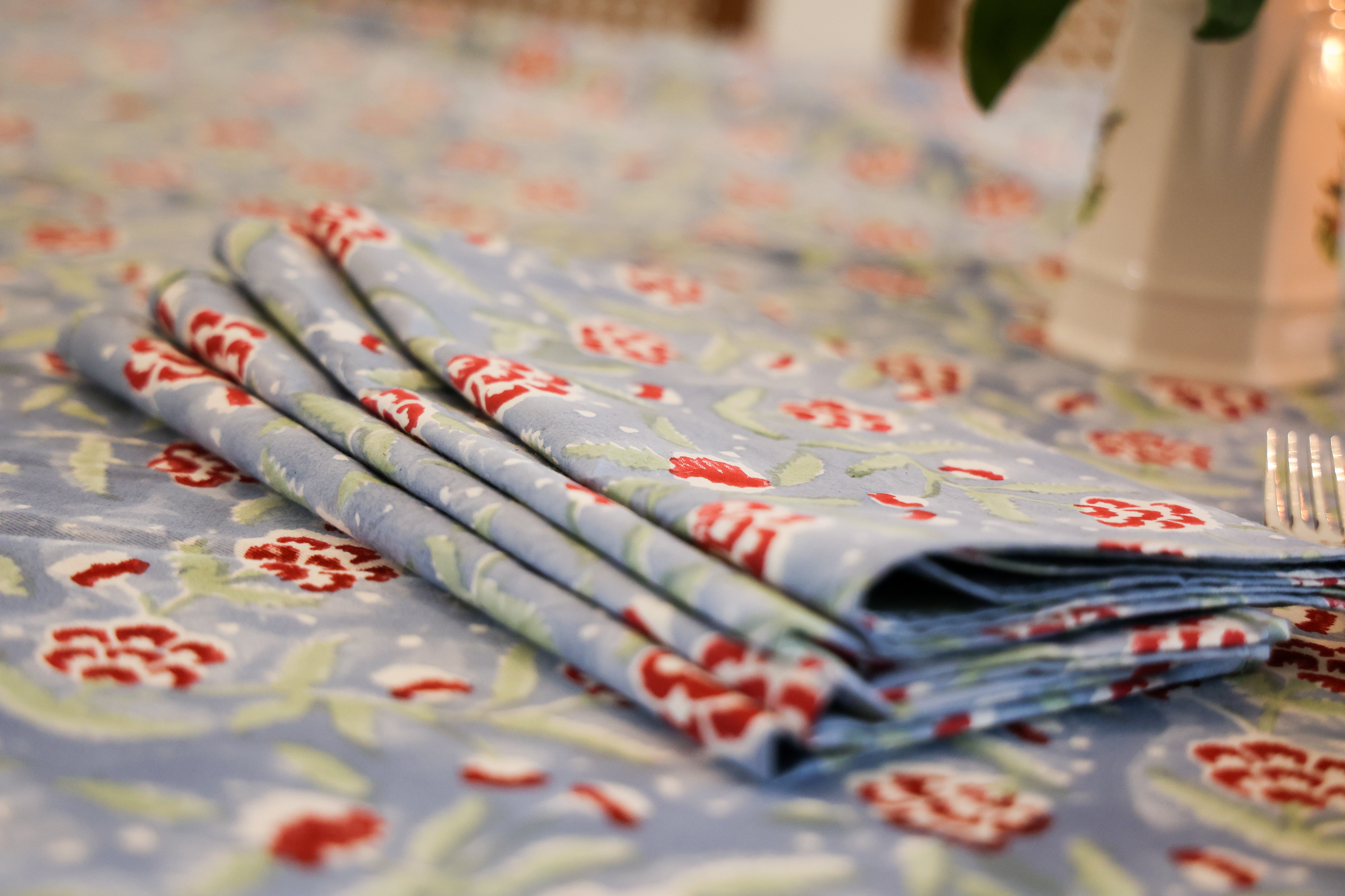 PRODUCT DESCRIPTION: These napkins come in a set of 4, 20” square. They are hand block printed on percale, which is a wrinkle-resistant, very soft but durable fabric.